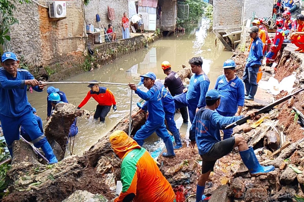 Sebanyak 50 personel gabungan bergerak cepat menangani turap Kali Baru yang longsor di RT 03/02, Kelurahan Batu Ampar, Kecamatan Kramat…