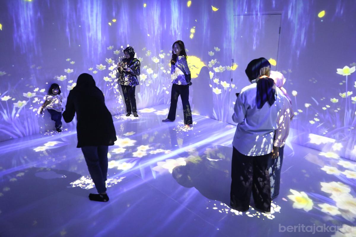 Sejumlah pengunjung mencoba berbagai permainan di Studio Imersif Perpustakaan Jakarta dan Pusat Dokumen Sastra HB Jassin, Taman Ismail Marzuki (TIM), Menteng, Jakarta Pusat, Kamis (19/2). Studio imersif yang menghadirkan perpaduan antara teknologi, arsip digital, dan ruang eksplorasi kreatif ini memungkinkan pengunjung menikmati literasi dengan kemasan yang lebih menarik sambil menunggu waktu berbuka puasa.
