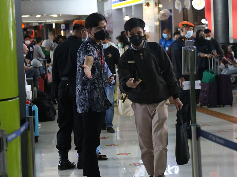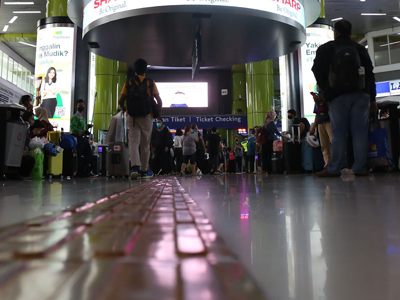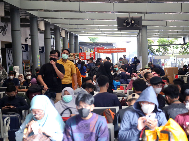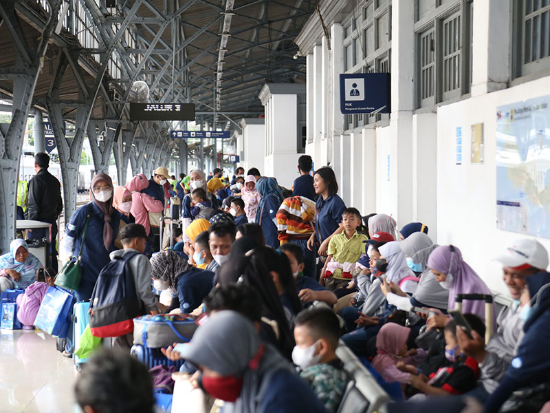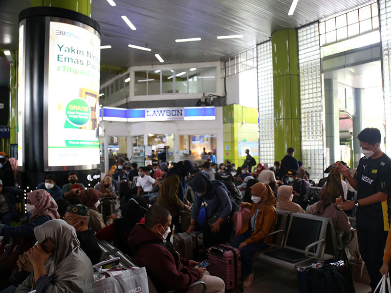Memasuki H-3 hari raya Idulfitri 1443 Hijriah, lonjakan penumpang yang hendak mudik terjadi di berbagai lokasi keberangkatan seperti terminal, stasiun, dan bandara. Kondisi yang sama terjadi di Stasiun Pasar Senen dan Gambir, Jakarta Pusat, Jumat (29/4). Berdasarkan data dari PT Kereta Api Indonesia (KAI) pada pukul 10.00 WIB, terdapat 35 kereta api (KA) beroperasi di Stasiun Gambir, delapan di antaranya merupakan KA tambahan dengan volume penumpang berangkat sebanyak 16.100 orang. Sementara itu di Stasiun Pasar Senen terdapat 28 KA beroperasi, dua di antaranya merupakan KA Tambahan dengan volume penumpang berangkat sebanyak 18.600 orang. Masa Angkutan Lebaran untuk perjalanan KA ditetapkan H-10 sampai H+10 Idulfitri atau 22 April sampai 13 Mei 2022 dengan kapasitas penumpang 100 persen. (Foto: Mochamad Tresna Suheryanto/beritajakarta.id)