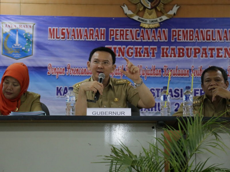 Gubernur DKI Jakarta, Basuki Tjahaja Purnama membuka sekaligus memberikan masukan Musyawarah Perencanaan Pembangunan (Musrenbang) tingkat Kabupaten Administrasi Kepulauan Seribu. Musrenbang berlangsung di ruang pola Kantor Bupati, Pulau Pramuka, Selasa (07/04/2015).(Foto: Reza / Beritajakarta.com )