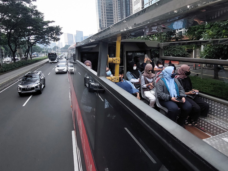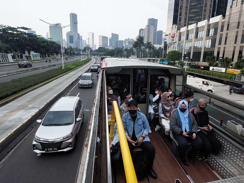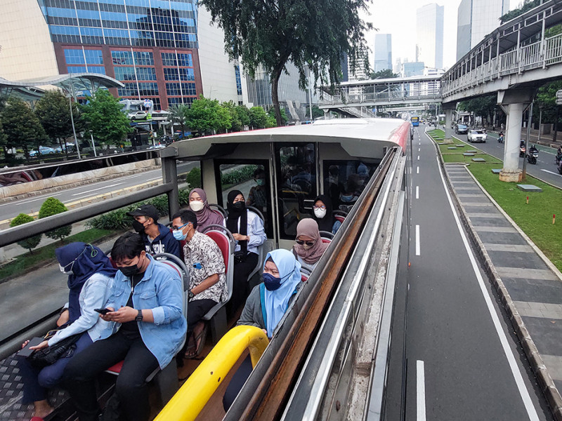 Puluhan warga menikmati pemandangan gedung-gedung pencakar langit Ibu Kota dari atas bus tingkat wisata Transjakarta, Selasa (10/5). Transjakarta menghadirkan layanan bus wisata #JakartaExplorer Rute BW2 Jakarta Baru (Juanda-Kota Tua PP) dan BW4 Pencakar Langit (IRTI Monas-Bundaran Senayan PP) yang beroperasi pada 3-11 Mei 2022. Jam operasional layanan tersebut dimulai pukul 10.00 sampai 21.00 tanpa dikenakan biaya atau gratis. (Foto: Nugroho Sejati/beritajakarta.id)