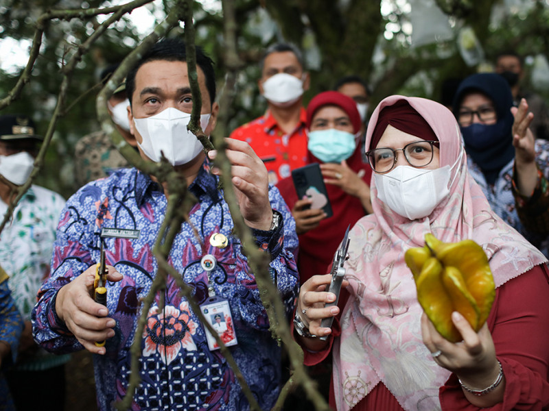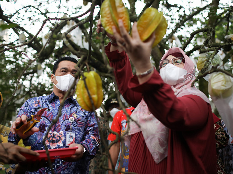 Wakil Gubernur DKI Jakarta, Ahmad Riza Patria dan Kepala Dinas Ketahanan Pangan, Kelautan, dan Pertanian (KPKP), Suharini Eliawati melakukan panen bersama buah belimbing dewi di Agro Edukasi Wisata (AEW) Ciganjur, Jagakarsa, Jakarta Selatan, Kamis (12/5). Kegiatan panen tersebut dalam rangka pengembangan buah belimbing dewi yang merupakan buah unggulan asli Jakarta. Wagub Ariza yang datang bersama istri, Ibu Elisa Sumarlin juga meninjau laboratorium SMKN 63 yang merupakan sekolah kejuruan di bidang pertanian. (Foto: Nugroho Sejati/beritajakarta.id)