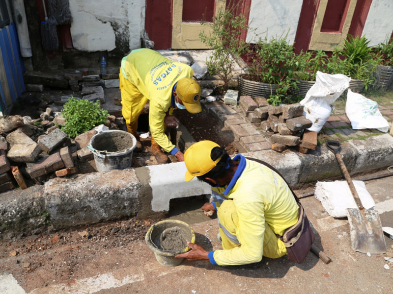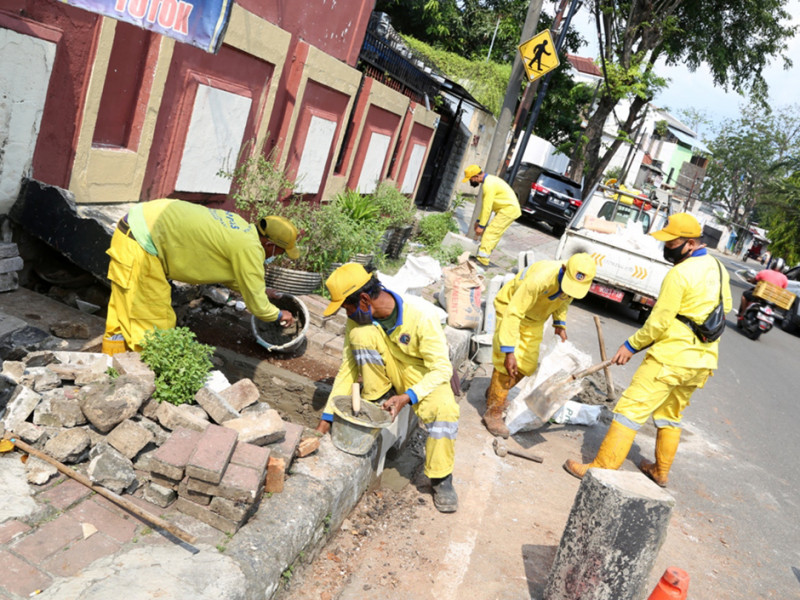Satuan Tugas (Satgas) Bina Marga Kecamatan Cempaka Putih, Jakarta Pusat, melakukan pembuatan mulut saluran dan tali air di Jalan Cempaka Putih Tengah, Kelurahan Cempaka Putih Timur, Selasa (17/5). Pengerjaan dimulai sejak pertengahan bulan April lalu dan ditargetkan rampung awal Juni mendatang. (Reza Hapiz/beritajakarta.id)
