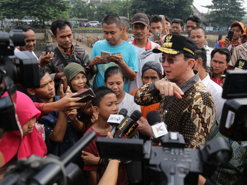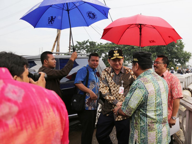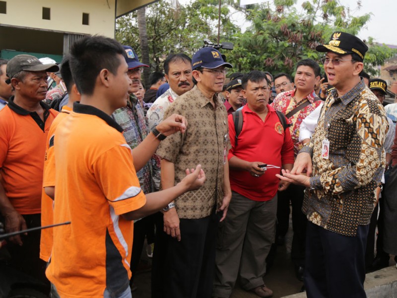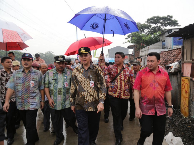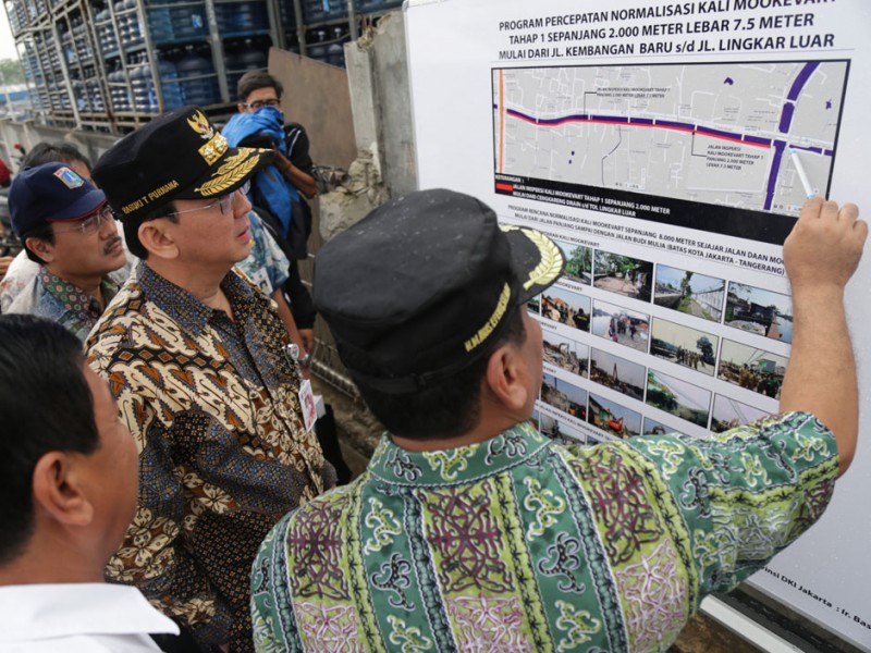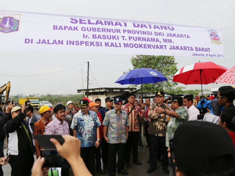 Gubernur DKI Jakarta, Basuki Tjahaja Purnama melakukan blusukan ke bantaran Kali Mookevart, Jakarta Barat, Kamis (09/04/2015). Blusukan dimaksudkan untuk meninjau langsung progres normalisasi dan refungsi Kali Mookevart sebgai upaya mengatasi banjir di Jakarta. (Foto : Reza/Beritajakarta.com)