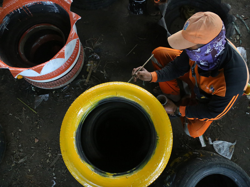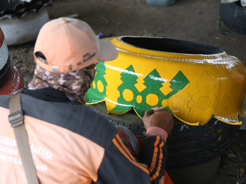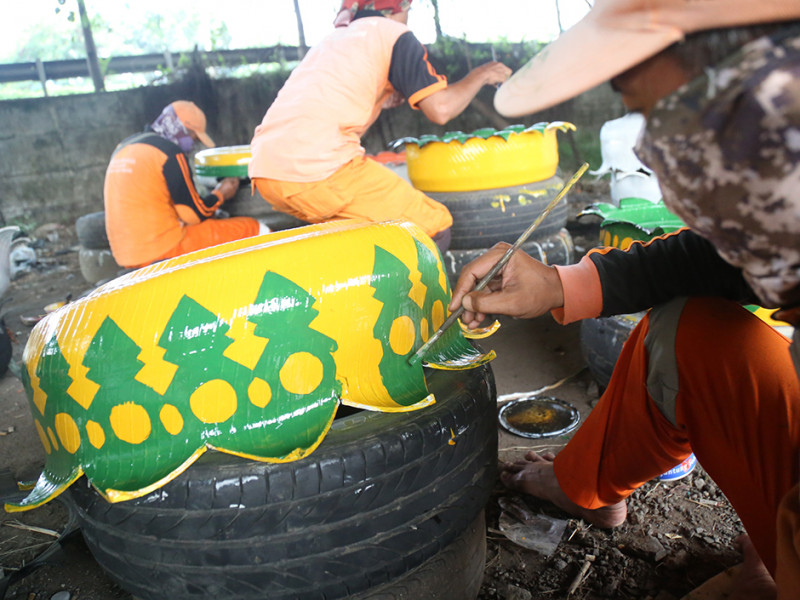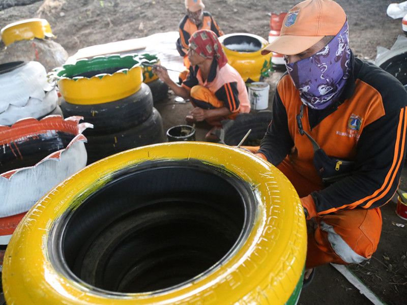 Memanfaatkan ban mobil yang sudah tidak terpakai, Petugas Penanganan Prasarana dan Sarana Umum (PPSU) Kelurahan Pulo Gebang menyulapnya menjadi pot tanaman hias. Pemanfaatan kembali limbah ban bekas sebagai upaya mengurangi sampah anorganik. Nantinya pot cantik dengan ragam ukuran dan warna tersebut ditempatkan pada sejumlah titik di lingkungan Kelurahan Pulo Gebang. (Foto: Mochamad Tresna Suheryanto/beritajakarta.id)