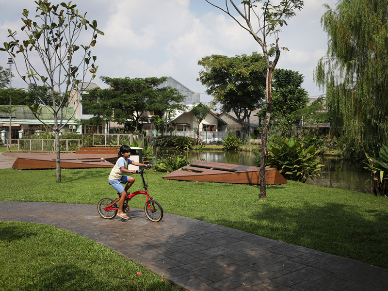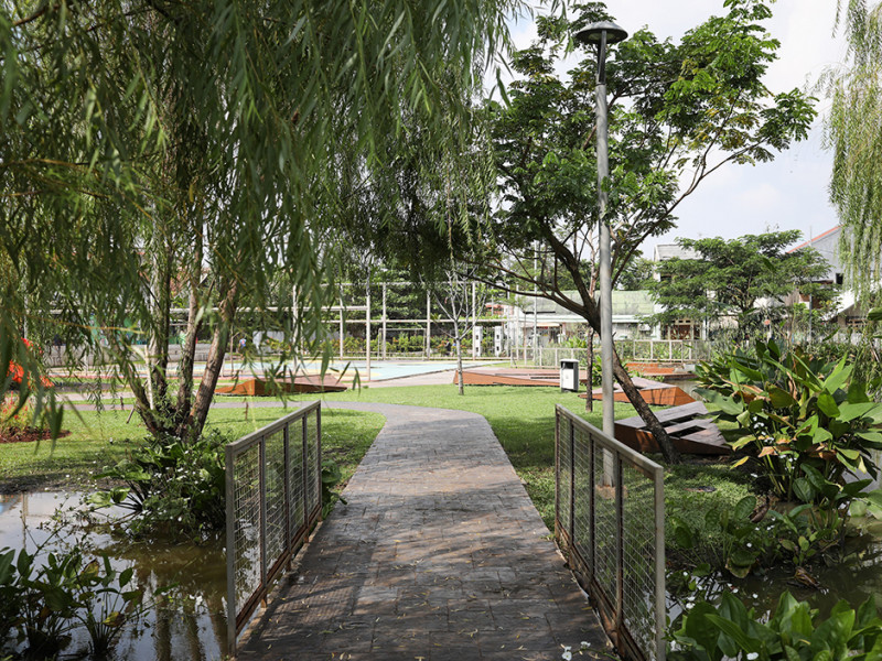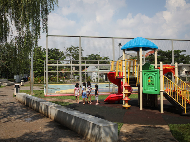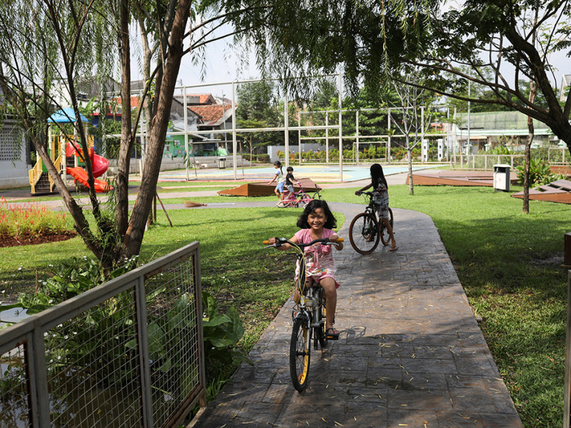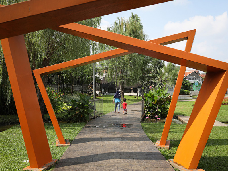 Keberadaan ruang terbuka hijau (RTH) makin dirasakan manfaatnya oleh masyarakat. Salah satunya adalah Taman Ciracas Ceria di Gang Masjid, Jalan Raya Centex, Ciracas, Jakarta Timur. Taman ini sangat aktif digunakan warga karena letaknya yang berada di tengah-tengah permukiman. (Foto: Nugroho Sejati/beritajakarta.id)
