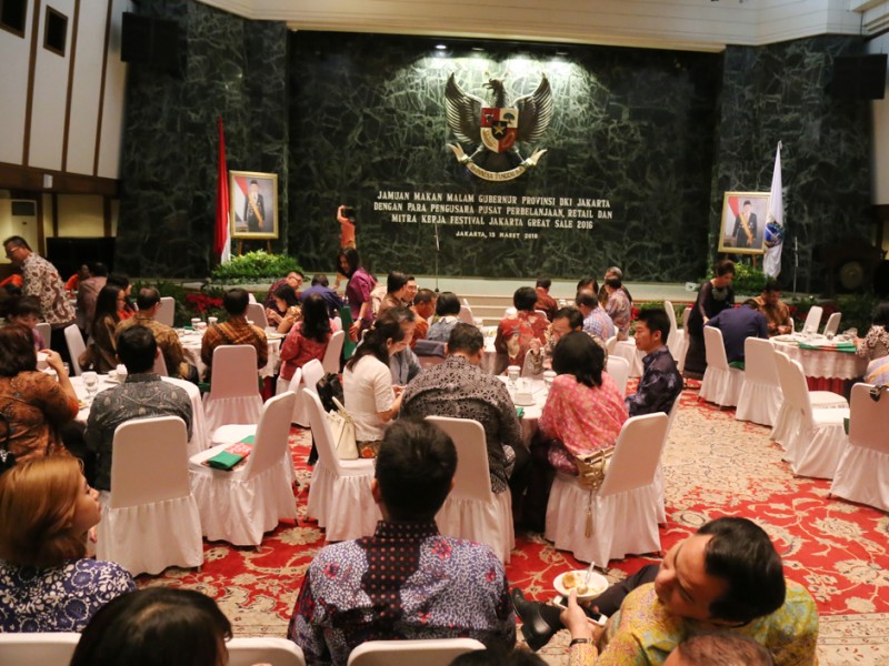 Gubernur DKI Jakarta, Basuki Tjahaja Purnama memberikan arahan terkait pelaksanaan Festival Jakarta Great Sale (FJGS) Tahun 2015. Arahan dan motivasi disampaikan Basuki kepada para pengelola pusat perbelanjaan dan pengusahan retail di Balaikota DKI Jakarta, Jumat (10/04/2015) malam. (Foto : Yopie/Beritajakarta.com)