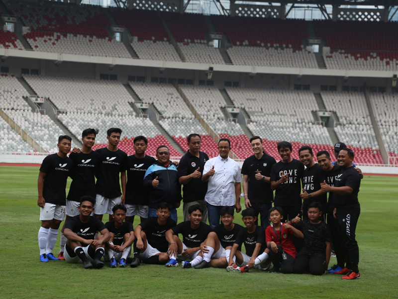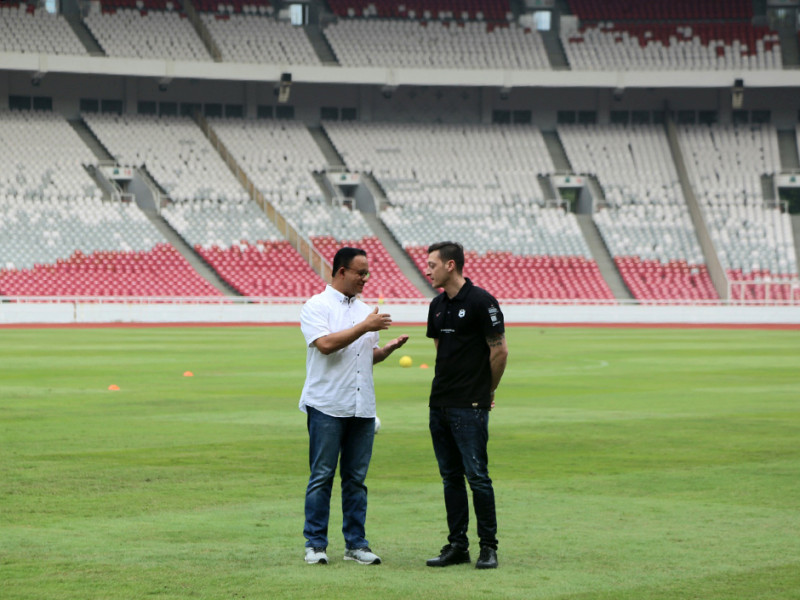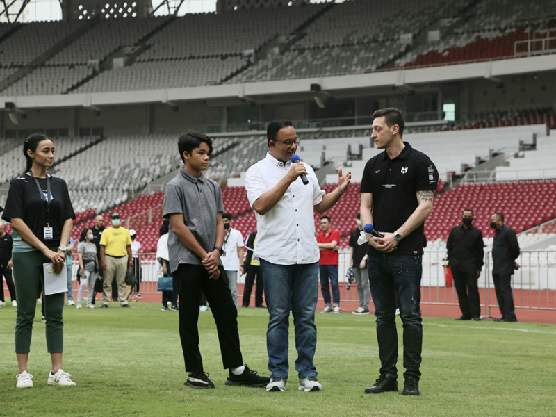 Gubernur DKI Jakarta, Anies Baswedan menghadiri Coaching Clinic Atlet Sepak Bola Provinsi DKI Jakarta di Stadion Utama Gelora Bung Karno (SUGBK), Jakarta Pusat, Kamis (26/5). Dalam coaching clinic kali ini, sejumlah peserta yang didominasi anak-anak muda berkesempatan bertemu langsung dan berbagi pengalaman dengan bintang sepak bola asal Jerman, Mesut Ozil. (Foto: Reza Hapiz/beritajakarta.id)