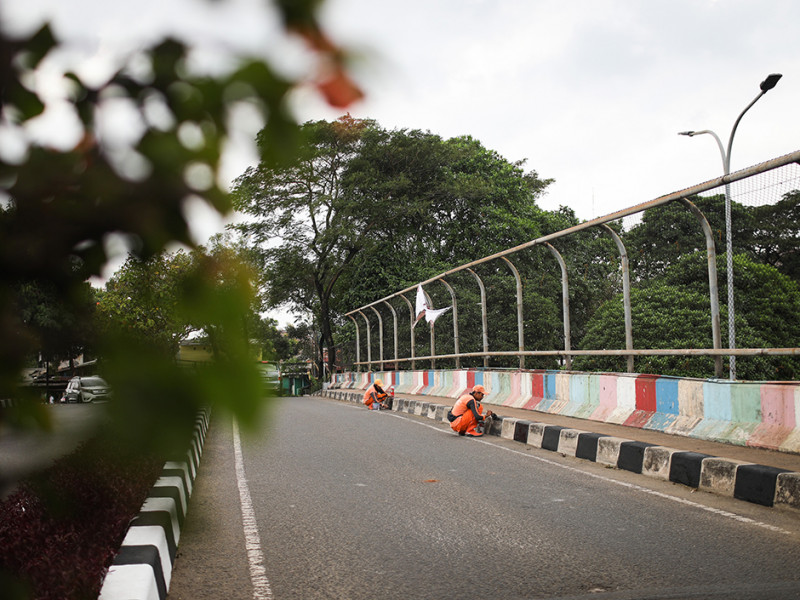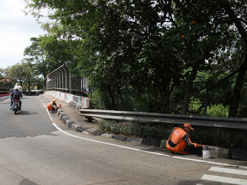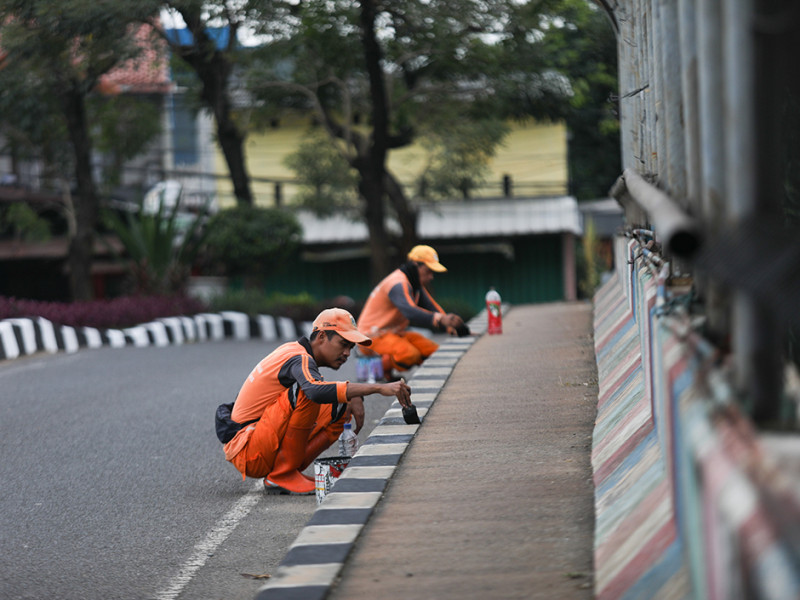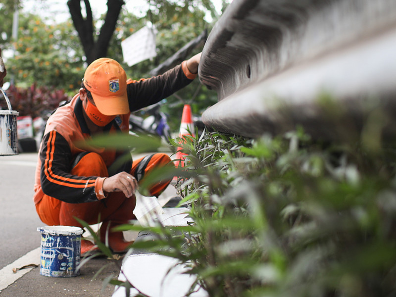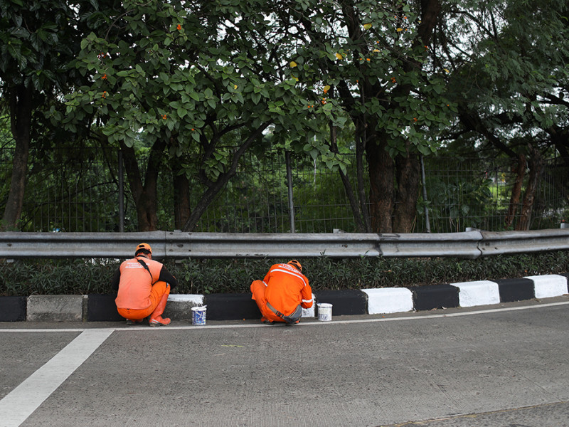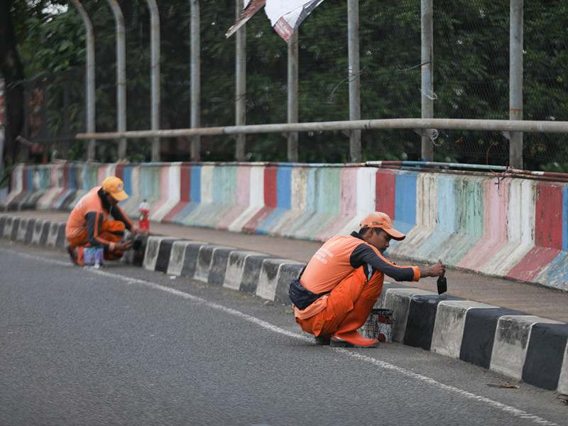 Petugas Penanganan Prasarana dan Saran Umum (PPSU) Kelurahan Bambu Apus mengecat ulang kanstin di Jalan Raya Mabes Hankam, Kecamatan Cipayung, Jakarta Timur, Jumat (27/5). Pengecatan kanstin dilakukan sepanjang 1,5 kilometer. (Foto: Nugroho Sejati/beritajakarta.id)