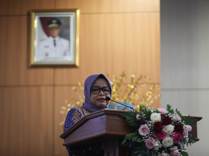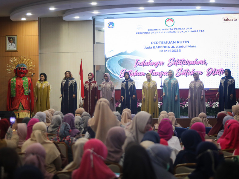 Dharma Wanita Persatuan (DWP) Provinsi DKI Jakarta mengadakan halalbihalal di Aula Kantor Dinas Teknis Bapenda Lantai 2, Kecamatan Tanah Abang, Jakarta Pusat, Selasa (31/5). Halalbihalal ini dihadiri langsung Penasihat DWP Provinsi DKI Jakarta, Fery Farhati dan Elisa Sumarlin, serta Ketua DWP DKI Jakarta, Komariah Marullah. (Foto: Nugroho Sejati/beritajakarta.id)