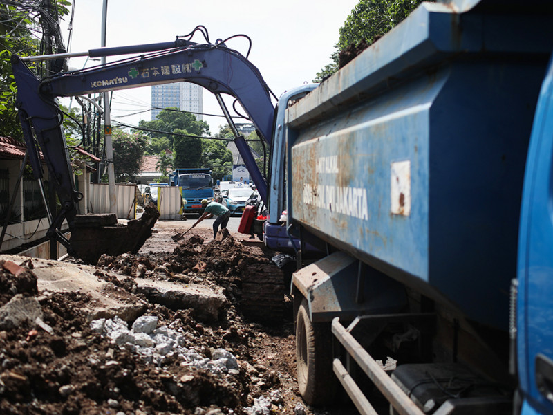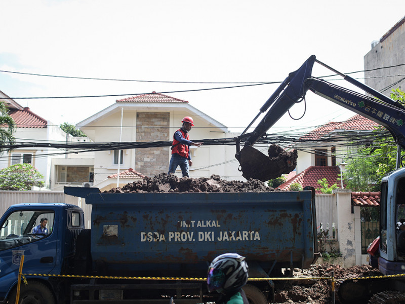 Petugas Dinas Sumber Daya Air (SDA) DKI Jakarta membersihkan tanah bekas galian proyek saluran air di sekitar Tugu Proklamasi, Kelurahan Pegangsaan, Menteng, Jakarta Pusat, Kamis (2/6). Saat ini, kawasan sekitar Tugu Proklamasi tengah dilakukan penataan saluran air dan jalur pejalan kaki (trotoar). Penataan untuk mencegah genangan sekaligus memberikan kenyamanan bagi pejalan kaki. (Foto: Nugroho Sejati/beritajakarta.id)