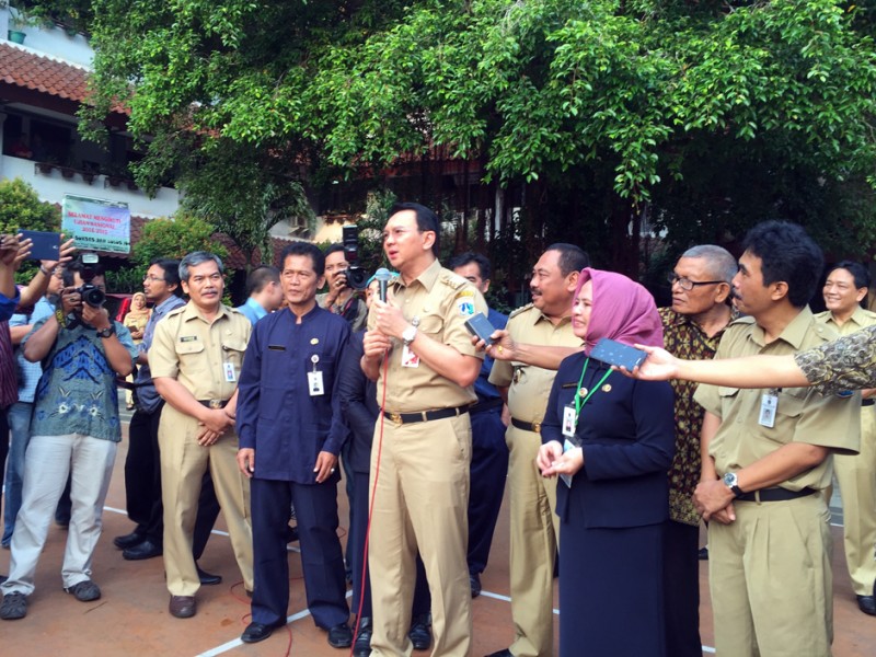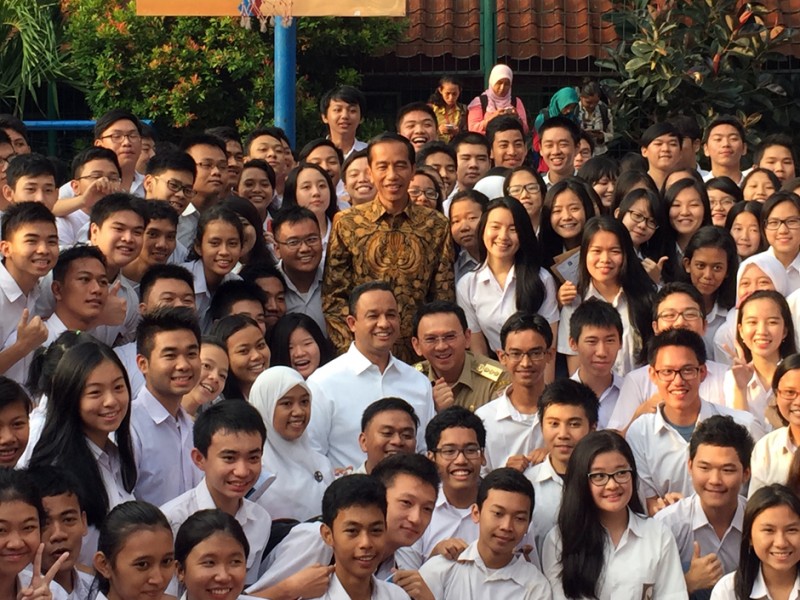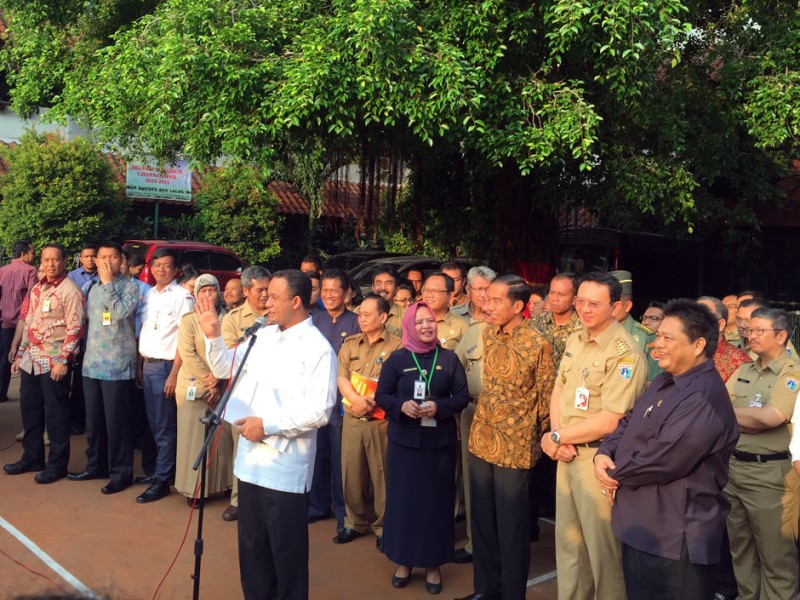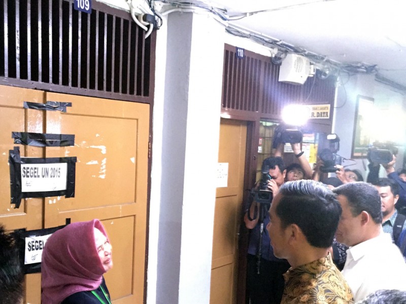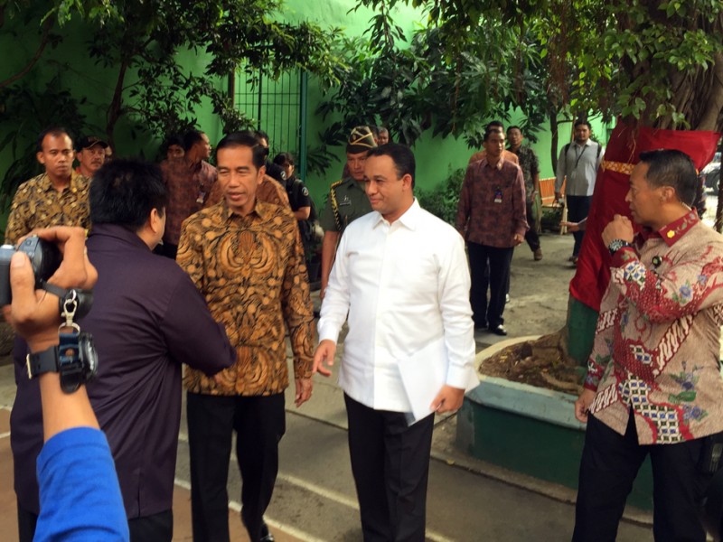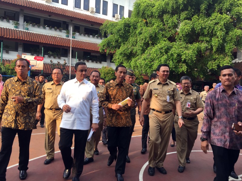 Gubernur DKI Jakarta, Basuki Tjahaja Purnama bersama Presiden Republik Indonesia Jokowi serta Menteri Pendidikan dan Kebudayaan, Anies Baswedan meninjau pelaksanaan Ujian Nasional. Peninjauan dilakukan di SMA Negeri 2, Jalan Gajah Mada, Jakarta Barat dan SMA Negeri 1, Jakarta Pusat, Selasa (14/04/2015). Turut menemani Jokowi dan Basuki, Menteri Pendidikan dan Kebudayaan Republik Indonesia, Anies Baswedan dan Kepala Dinas Pendidikan DKI Jakarta, Arie Budiman. (Foto : Diskominfomas dan Dinas Pendidikan DKI Jakarta)