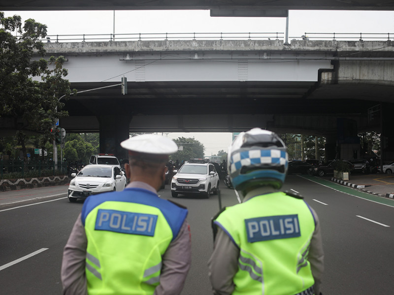 Sejumlah personel kepolisian dan Dinas Perhubungan (Dishub) DKI Jakarta berjaga di Jalan Pramuka, Matraman, Jakarta Timur. Jalan Pramuka merupakan salah satu dari 13 ruas jalan di Jakarta yang baru dikenakan kebijakan ganjil genap (gage) per hari ini, Senin (6/6). Kebijakan ganjil genap berlaku pada pukul 06.00-10.00 dan 16.00-21.00. (Foto: Nugroho Sejati/beritajakarta.id)