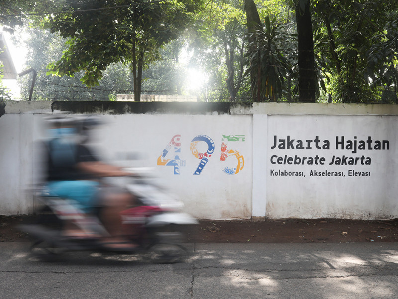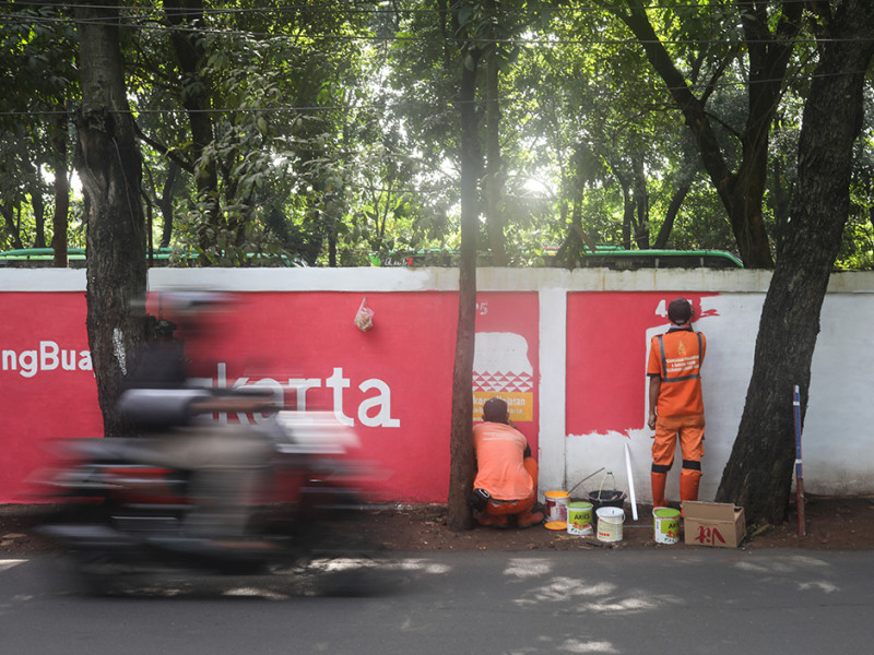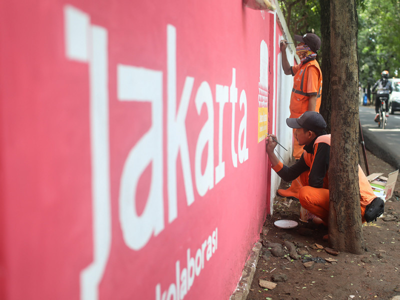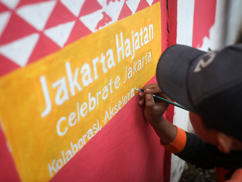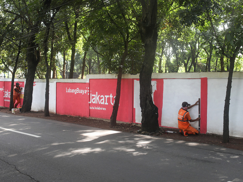 Sebanyak empat petugas Penanganan Prasarana dan Sarana Umum (PPSU) Kelurahan Lubang Buaya menggambar mural Hari Ulang Tahun (HUT) ke-495 Kota Jakarta di dinding luar Monumen Pancasila Sakti, Cipayung, Jakarta Timur, Rabu (8/6). Tema yang diambil untuk ulang tahun Kota Jakarta kali ini adalah Jakarta Hajatan sebagai simbol kolaborasi, akselerasi, dan elevasi Kota Jakarta. (Foto: Nugroho Sejati/beritajakarta.id)