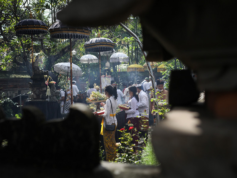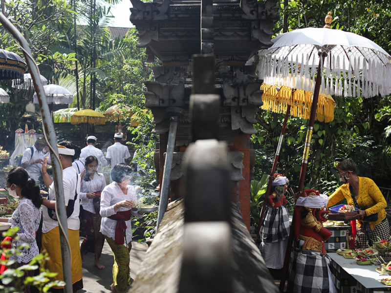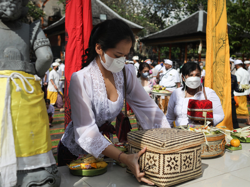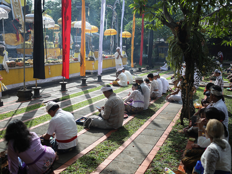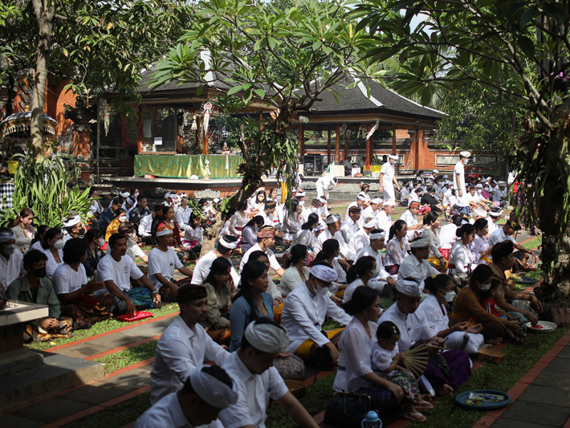 Umat Hindu mengikuti persembahyangan Hari Raya Galungan di Pura Aditya Jaya, Rawamangun, Jakarta Timur, Rabu (8/6). Hari Raya Galungan merupakan simbol perayaan kemenangan kebaikan (Dharma) melawan kejahatan (Adharma). Hari suci umat Hindu ini diperingati setiap 210 hari sekali menurut perhitungan penanggalan Pawukon atau penanggalan tradisional Indonesia. (Foto: Nugroho Sejati/beritajakarta.id)