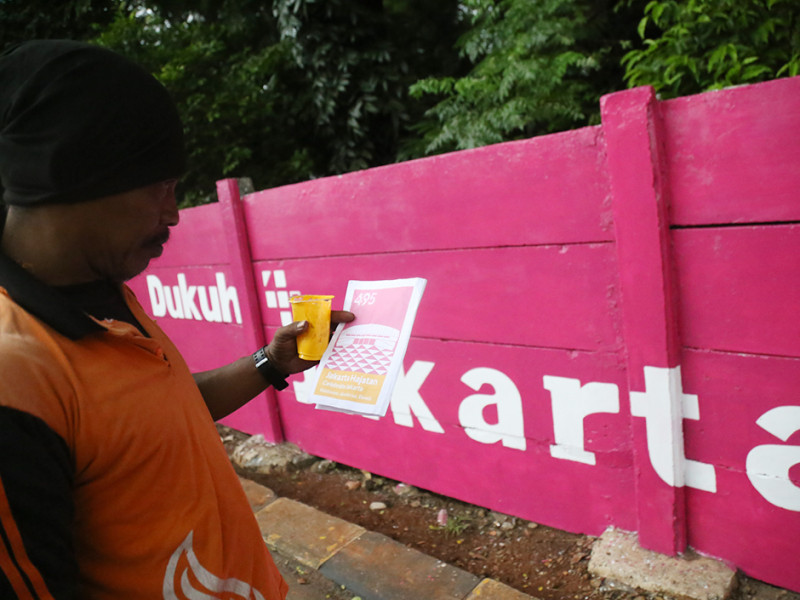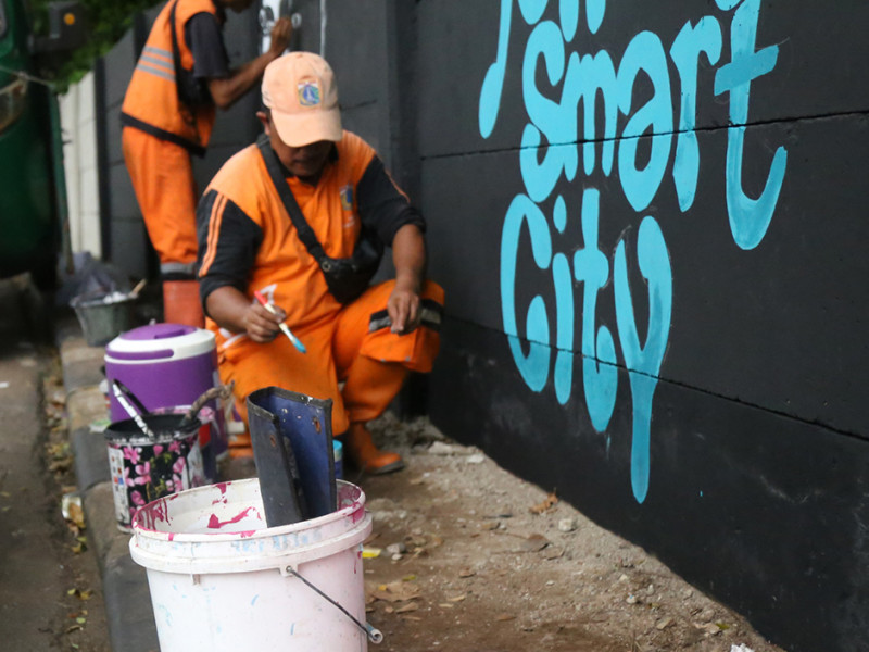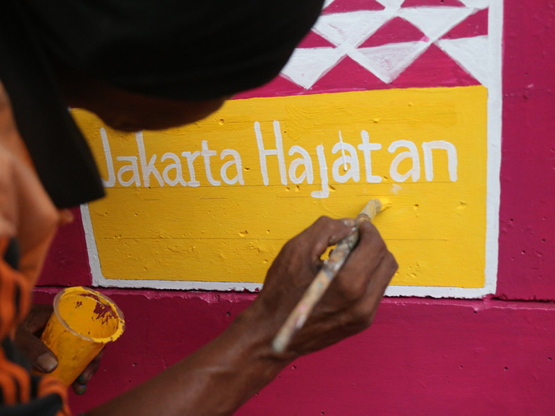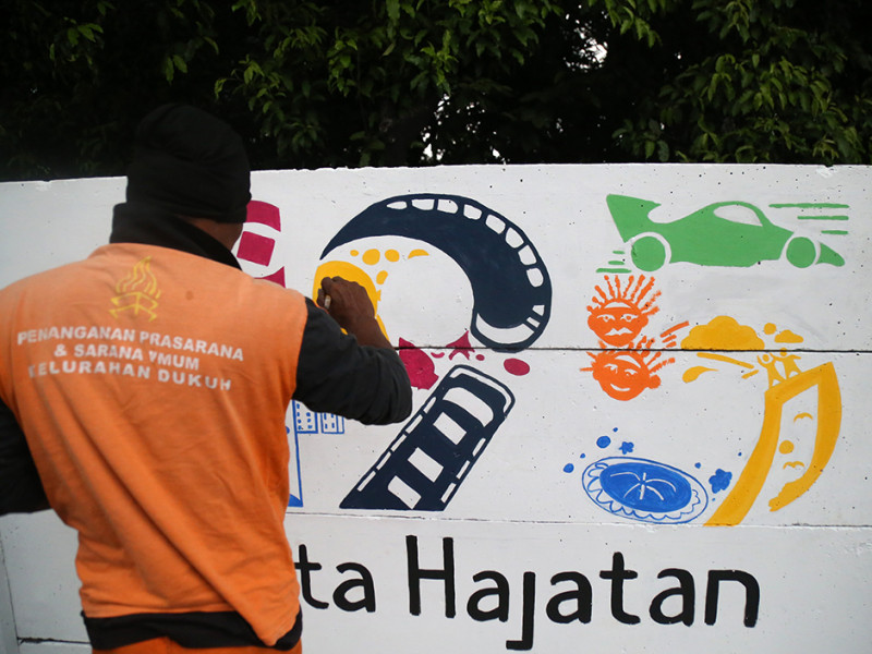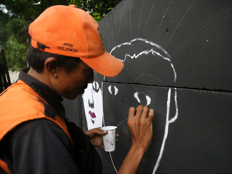 Kawasan Jalan Raya Pondok Gede, Kramat Jati, Jakarta Timur, Rabu (8/6) dipercantik dengan sentuhan mural bertemakan HUT ke-495 Jakarta. Pembuatan mural dikerjakan oleh petugas Penanganan Prasarana dan Sarana Umum (PPSU) Kelurahan Dukuh. (Foto: Mochamad Tresna Suheryanto/beritajakarta.id)