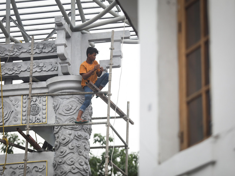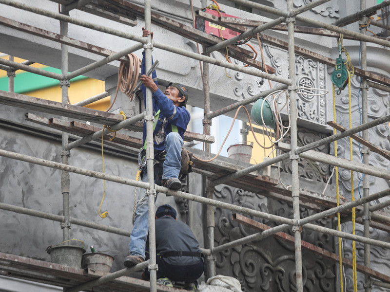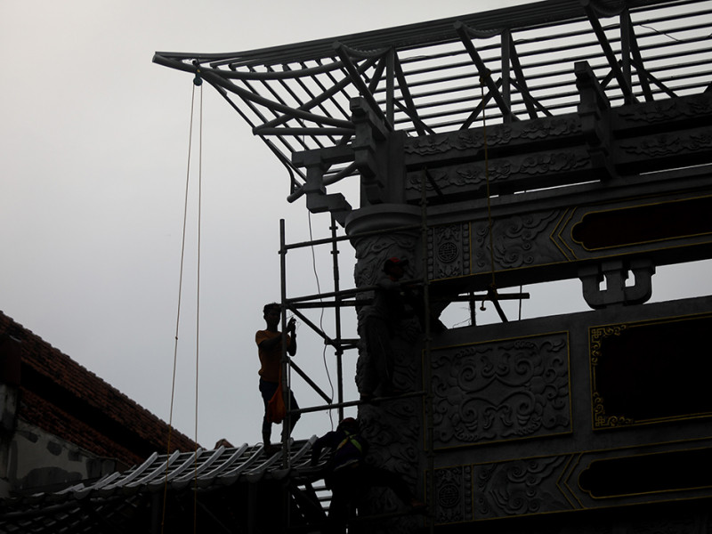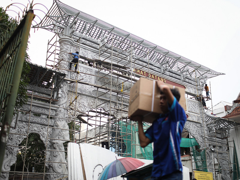Sejumlah pekerja membangun gapura di Jalan Pancoran, Kecamatan Taman Sari, Jakarta Barat, Kamis (9/6). Pembangunan gapura tersebut bertujuan mempercantik kawasan Chinatown (Pecinan) Glodok Pancoran. (Foto: Nugroho Sejati/beritajakarta.id)