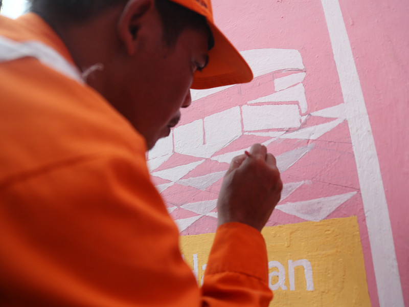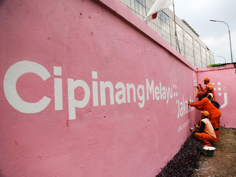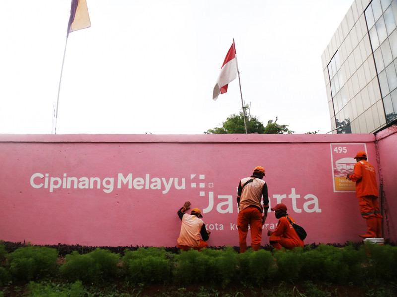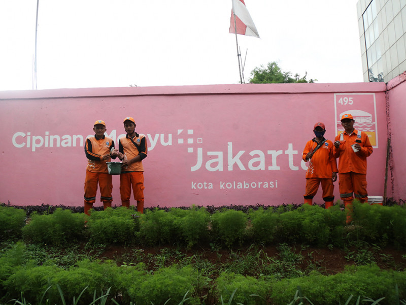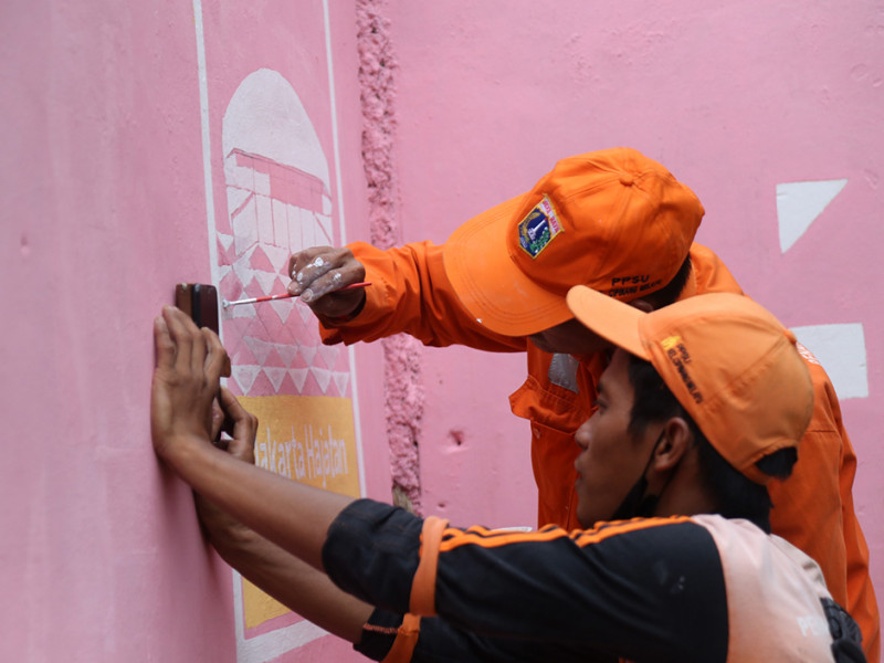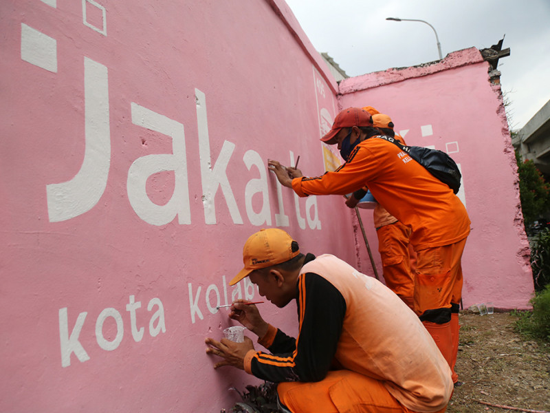 Petugas Penanganan Prasarana dan Sarana Umum (PPSU) Kelurahan Cipinang Melayu membuat mural di Jalan Inspeksi Tarum Barat, Kecamatan Makasar, Jakarta Timur, Kamis (9/6). Pembuatan mural ini dalam rangka memeriahkan HUT ke-495 Jakarta yang diperingati pada tanggal 22 Juni 2022. (Foto: Mochamad Tresna Suheryanto/beritajakarta.id)