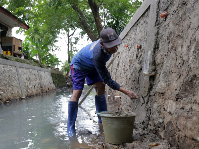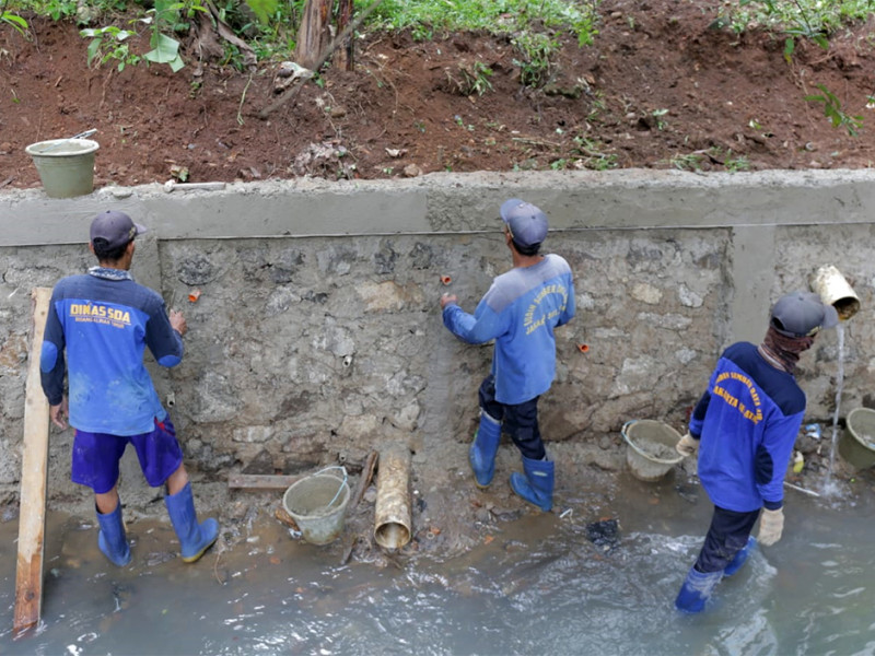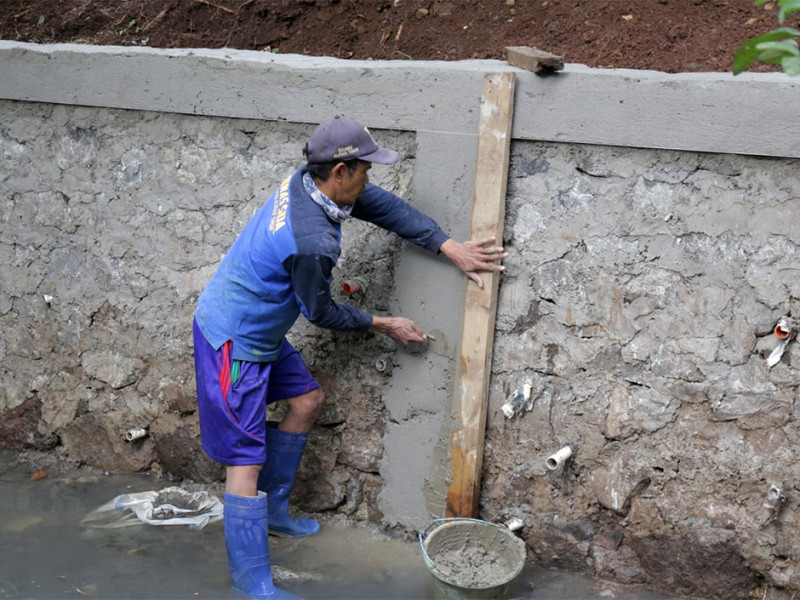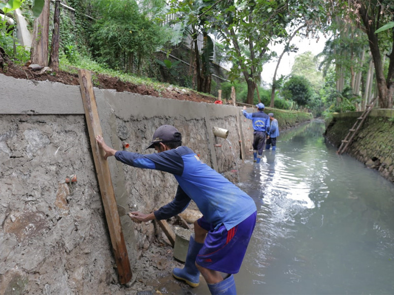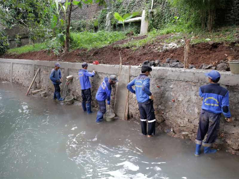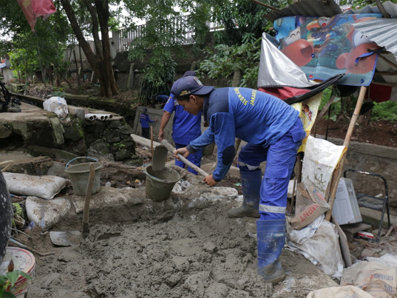 Satuan Pelaksana Sumber Daya Air (Satpel SDA) Kecamatan Kebayoran Baru, Jakarta Selatan, melakukan perbaikan turap Saluran Penghubung (Phb) Jelawe di Jalan B atu Lauser, Kelurahan Gunung, Kebayoran Baru, Jumat (10/6). Perbaikan ini menindaklanjuti permintaan warga melalui aplikasi JAKI. (Foto: Reza Hapiz/beritajakarta.id)