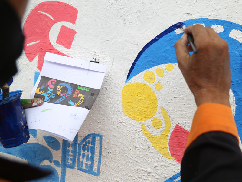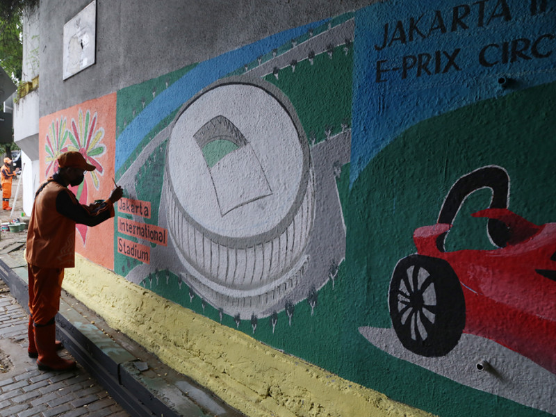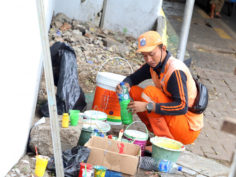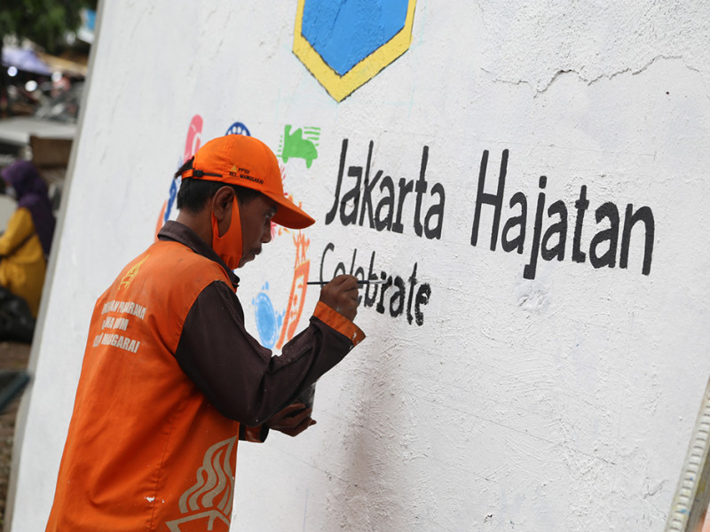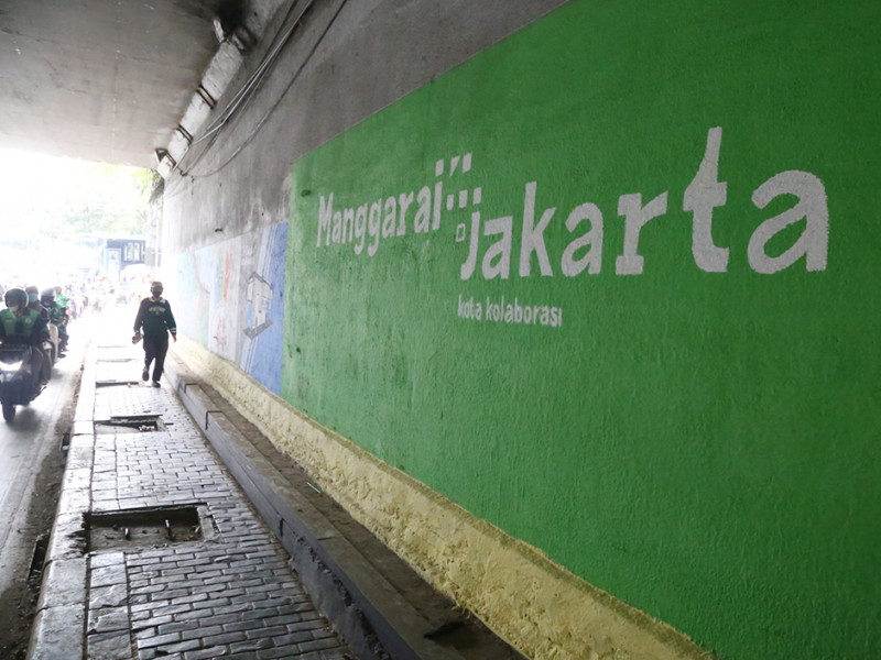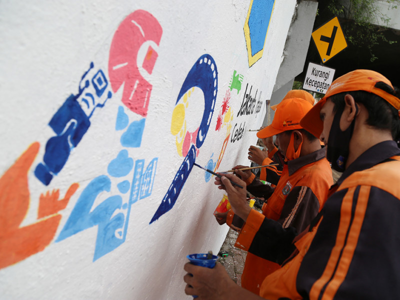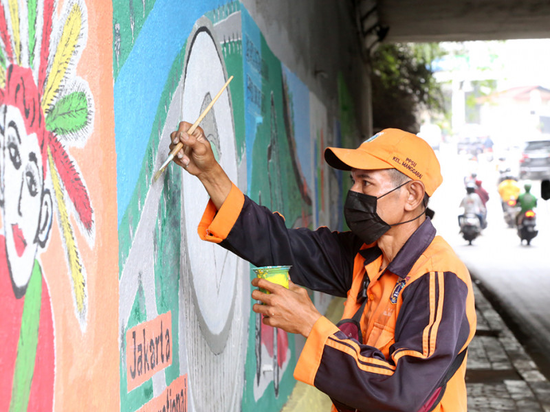 Terowongan Manggarai, Jakarta Selatan dipercantik dengan mural bertemakan HUT ke-495 Jakarta. Pembuatan mural tersebut dikerjakan oleh petugas Penanganan Prasarana dan Sarana Umum (PPSU) Kelurahan Manggarai. (Foto: Reza Hapiz/beritajakarta.id)