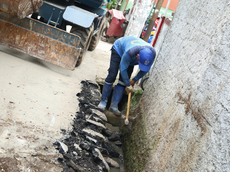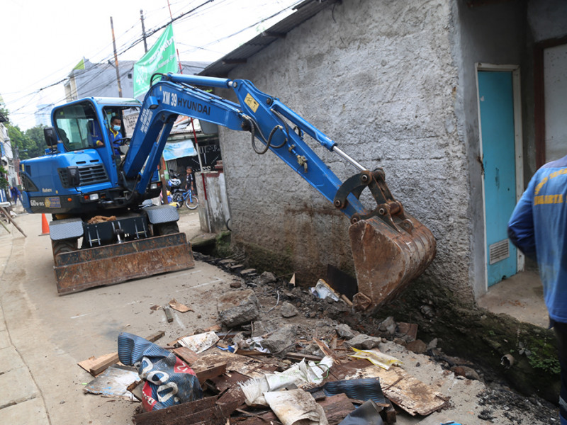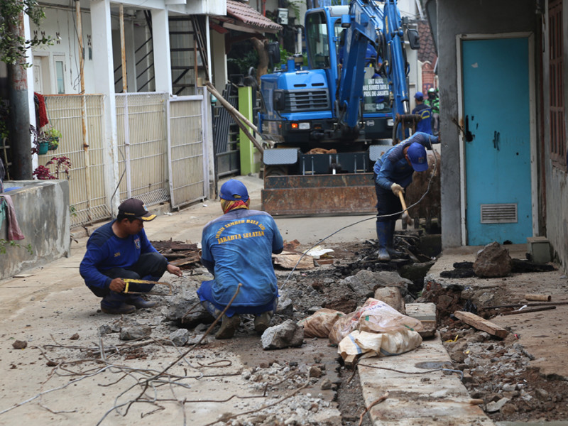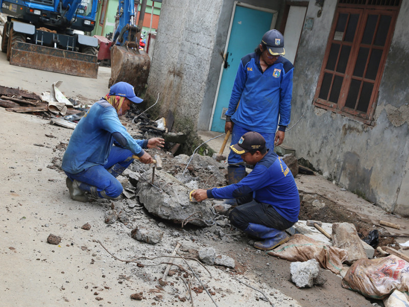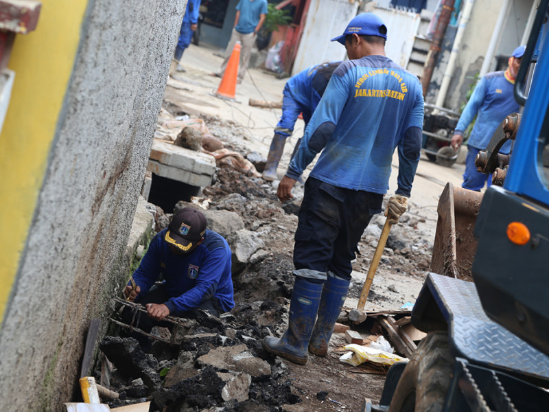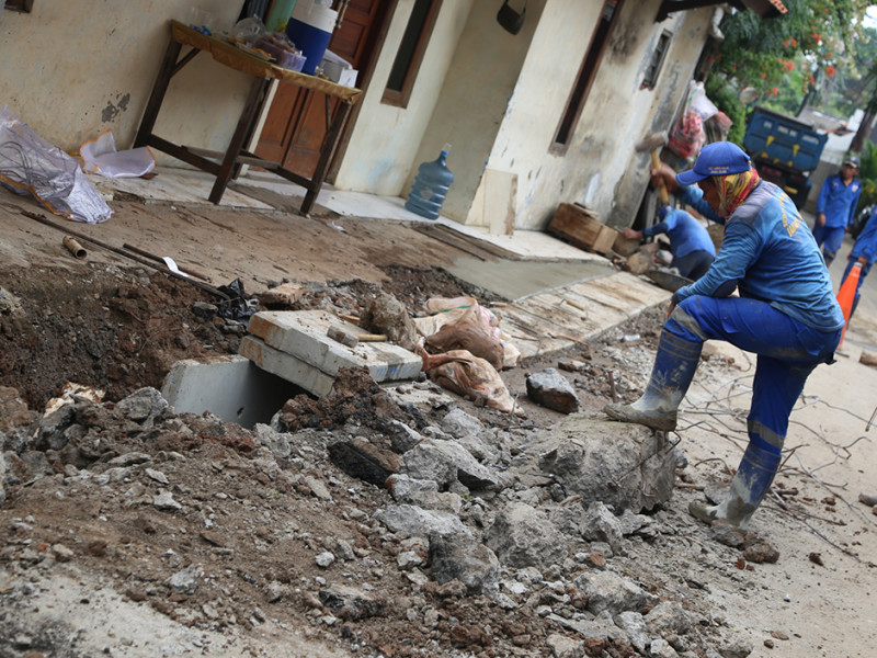 Satuan Tugas (Satgas) Sumber Daya Air Jakarta Selatan melakukan perbaikan saluran air di Jalan Jaha, Kelelurahan Cilandak Timur, Pasar minggu, Jakarta Selatan. Pengerjaan mengerahkan 10 personel dan satu unit alat berat. (Foto: Reza Hapiz/beritajakarta.id)