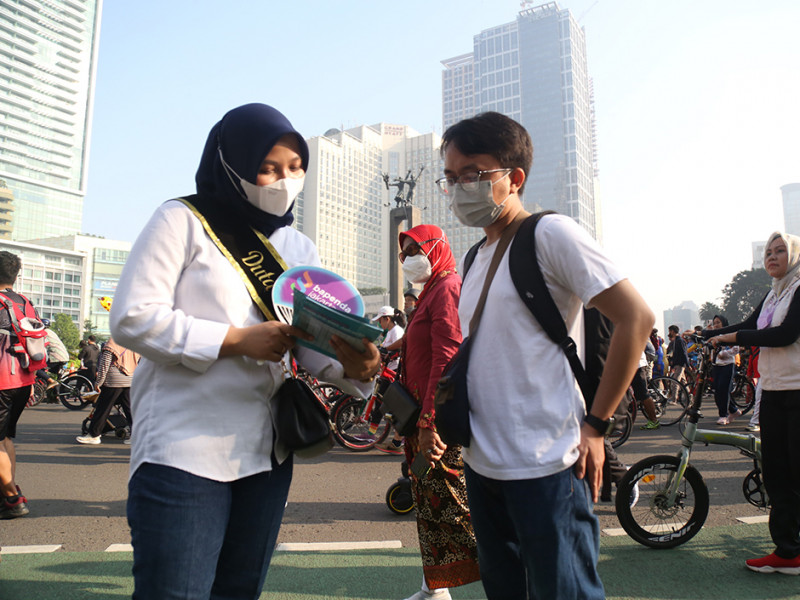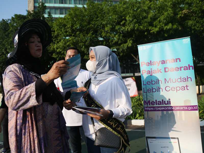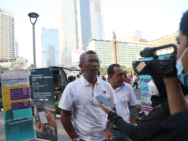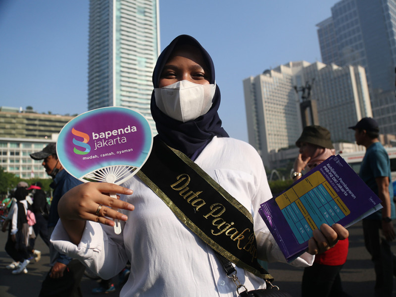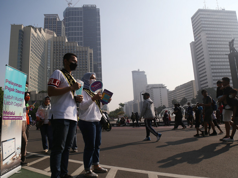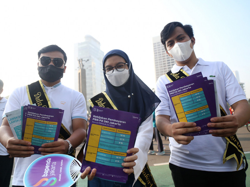 Badan Pendapatan Daerah (Bapenda) Provinsi DKI Jakarta menyosialisasikan Peraturan Gubernur (Pergub) Nomor 23 tahun 2022 tentang Kebijakan Penetapan dan Pembayaran Pajak Bumi dan Bangunan Perdesaan dan Perkotaan (PBB-P2). Sosialisasi dilakukan di area Hari Bebas Kendaraan Bermotor (HBKB) Jalan Sudirman-MH Thamrin, Jakarta Pusat, Minggu (19/6) . (Foto: Mochamad Tresna Suheryanto/beritajakarta.id)
