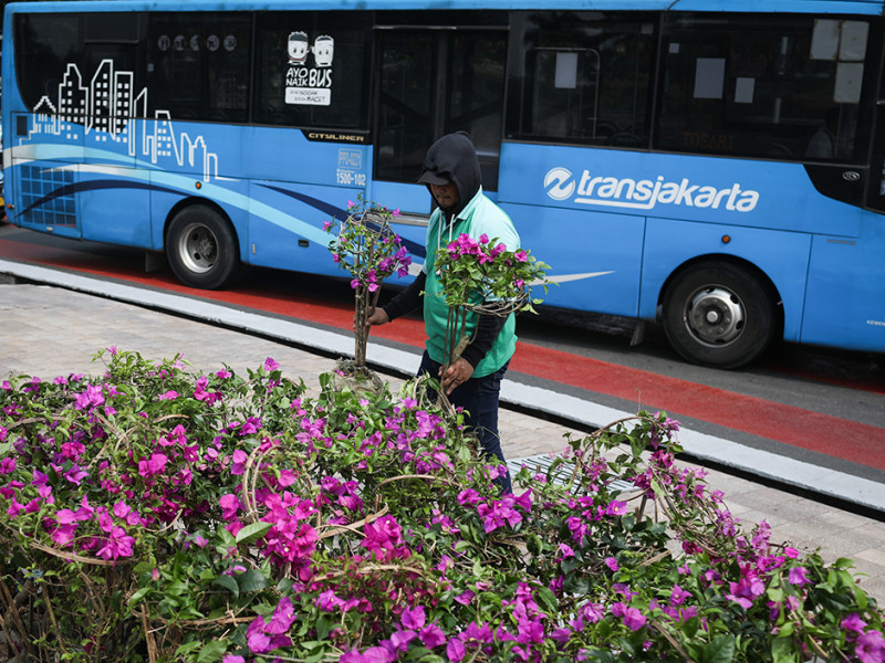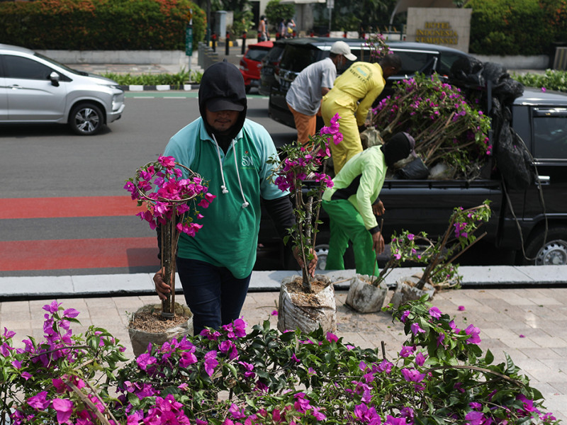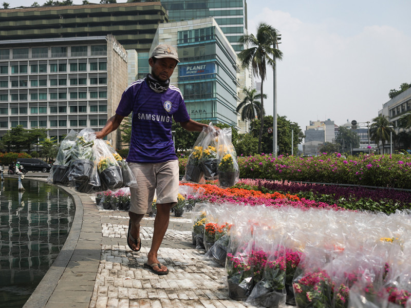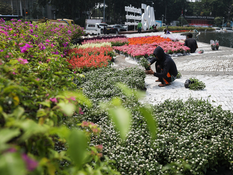 Petugas Dinas Pertamanan dan Kehutanan (Tamhut) DKI Jakarta bersama sejumlah pekerja melakukan persiapan beautifikasi Bundaran Hotel Indonesia (HI), Menteng, Jakarta Pusat, Senin (20/6). Dekorasi berupa logo Jakarta Hajatan dan peletakan bunga warna-warni di pinggir kolam Bundaran HI untuk memeriahkan HUT ke-495 Jakarta. (Foto: Nugroho Sejati/beritajakarta.id)