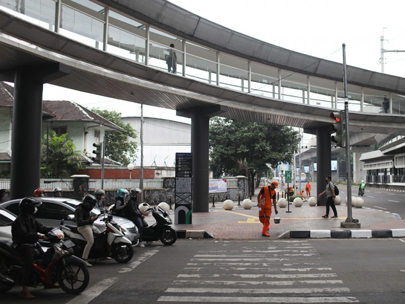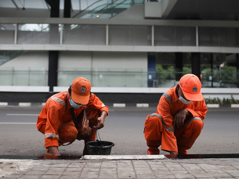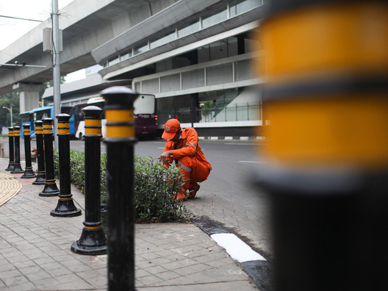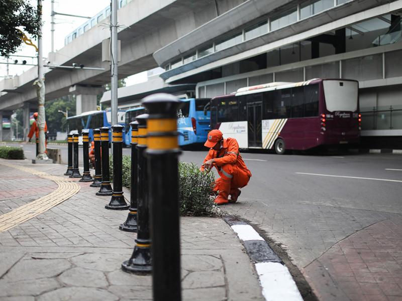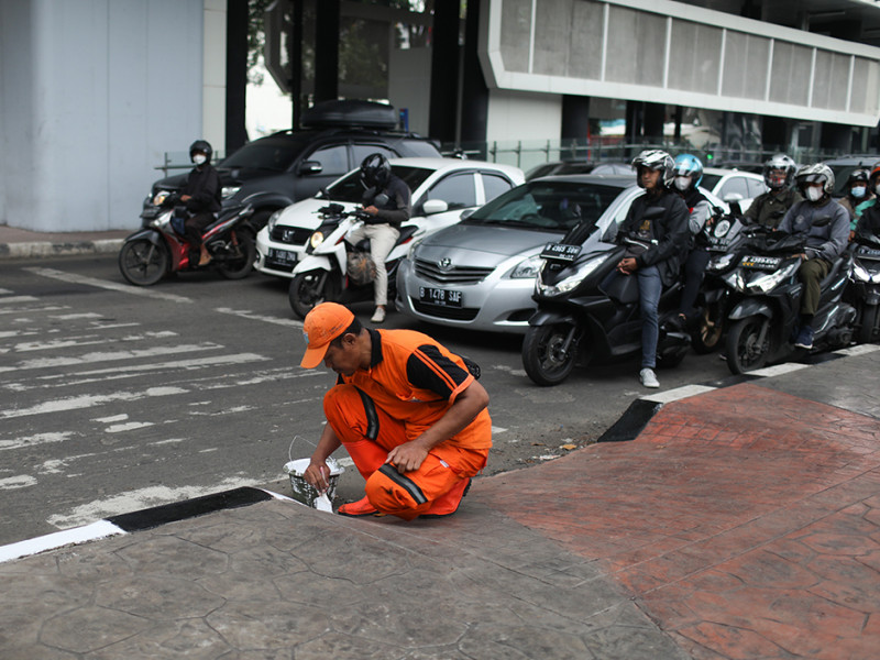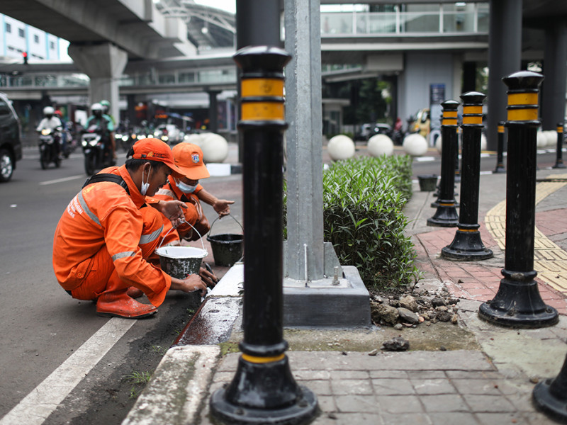 Petugas Penanganan Prasarana dan Sarana Umum (PPSU) Kelurahan Melawai mengecat ulang kanstin di bawah Halte Integrasi CSW, tepatnya di Jalan Trunojoyo, Kebayoran Baru, Jakarta Selatan, Selasa (21/6). Pengecatan dilakukan untuk meningkatkan estetika kawasan tersebut. (Foto: Nugroho Sejati/beritajakarta.id)