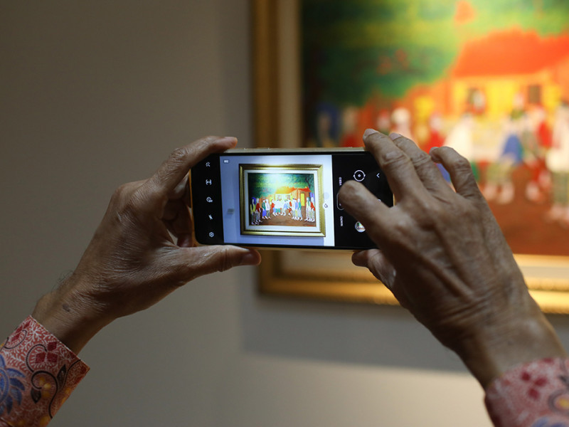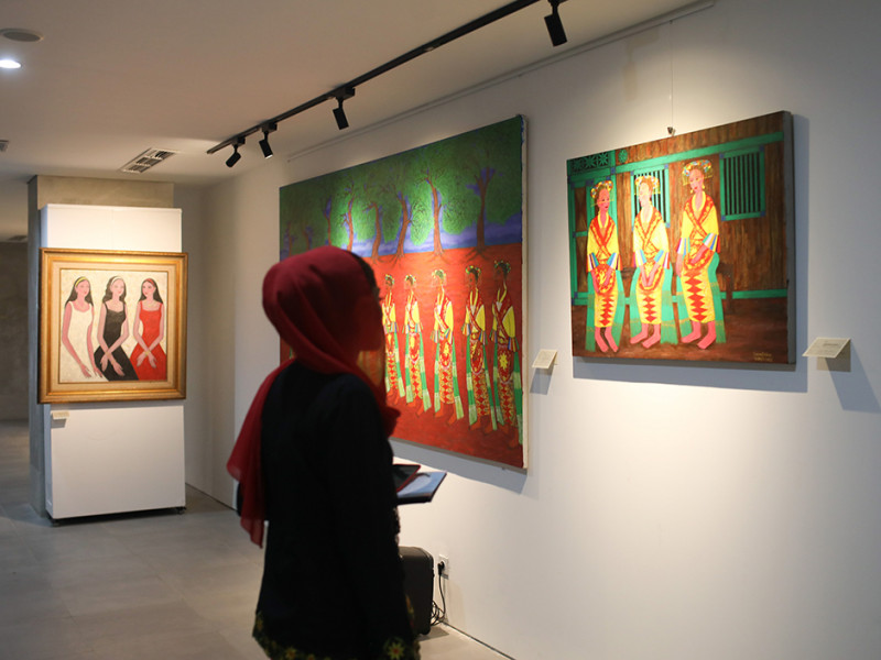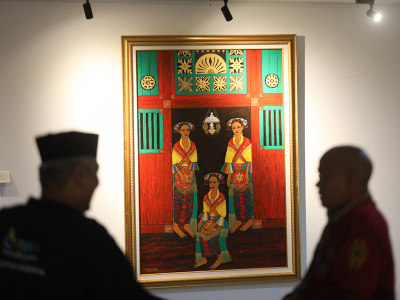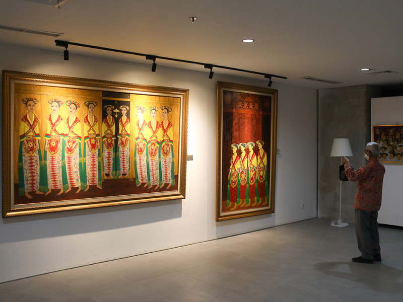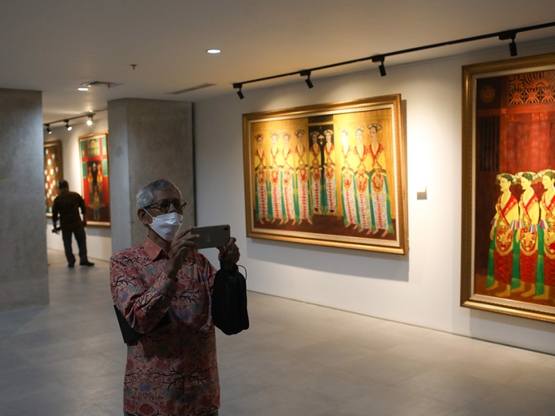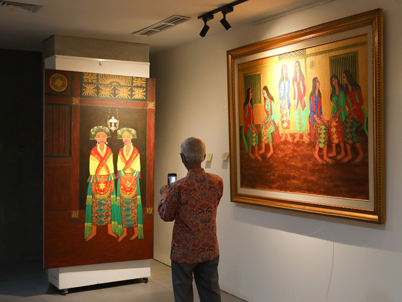 Pelukis Sarnadi Adam memamerkan karya-karyanya di Galeri Seni Gedung Panjang Lantai 2, Taman Ismail Marzuki (TIM), Menteng, Jakarta Pusat. Pameran bertajuk \"Betawi dalam Lukisan\" ini menampilkan 21 karya lukis yang bercerita tentang budaya Betawi serta suasana Jakarta tempo dulu. (Foto: Nugroho Sejati/beritajakarta.id)