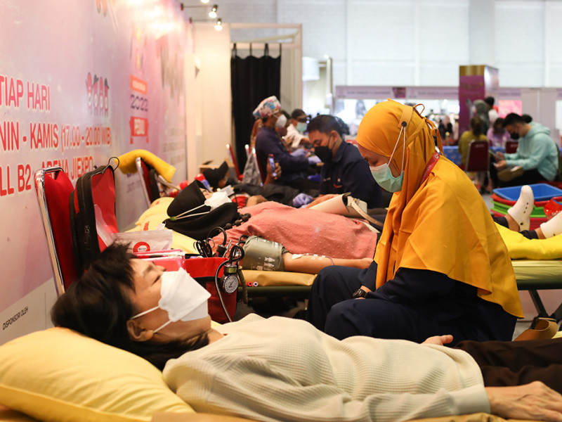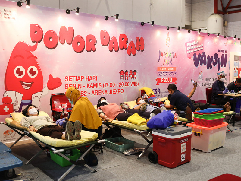 Sejumlah pengunjung Pekan Raya Jakarta (PRJ) mengikuti aksi donor darah di Hall B2, JIExpo Kemayoran, Jakarta Pusat, Rabu (29/6). Gerai donor darah di PRJ buka setiap hari Senin-Kamis mulai pukul 17.00-20.00. (Foto: Nugroho Sejati/beritajakarta.id)
