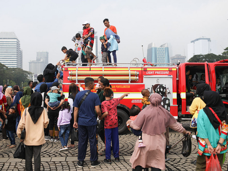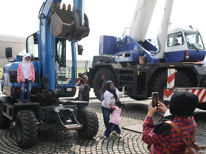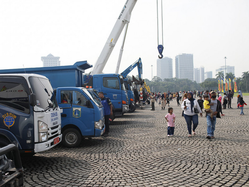 Warga tampak antusias melihat pameran sarana dan atraksi Organisasi Perangkat Daerah (OPD) Pemprov DKI Jakarta di Lapangan Plaza Selatan Monumen Nasional, Jakarta Pusat, Minggu (3/7). Beragam sarana kerja serta kendaraan operasional milik Dinas Sumber Daya Air, Gulkarmat, BPBD, dan Dinas Lingkungan Hidup yang dipamerkan berhasil mencuri perhatian pengunjung. Selain itu, Dinas Perpustakaan dan Arsip (Dispusip) menggelar pertunjukan dongeng untuk anak-anak. (Foto: Nugroho Sejati/beritajakarta.id)
