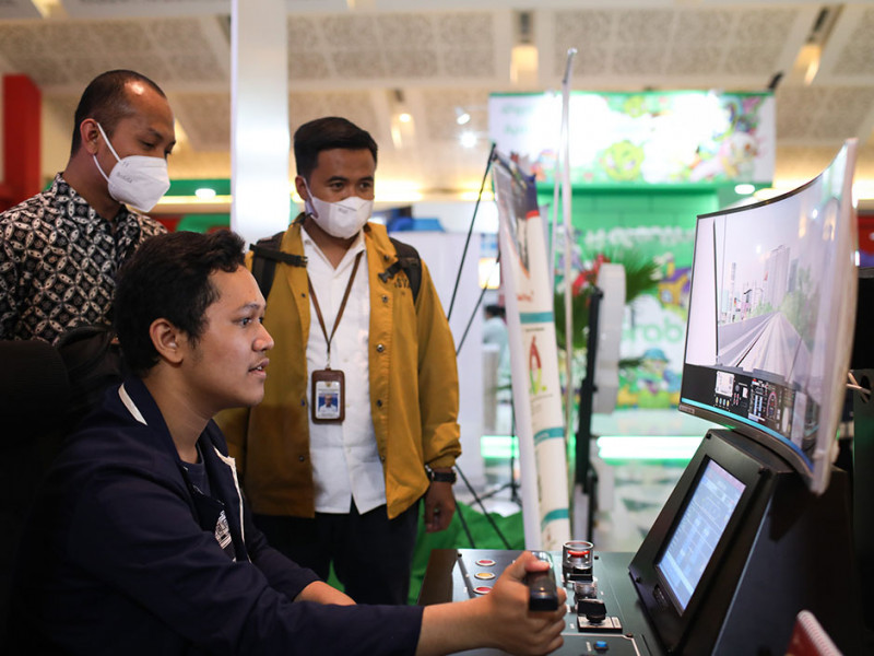PT LRT Jakarta menghadirkan train simulator di Paviliun Jakarta, Hall C1, JIExpo Kemayoran, Jakarta Pusat, 9 Juni-17 Juli 2022. Dalam train simulator tersebut, para pengunjung Pekan Raya Jakarta (PRJ) diberikan kesempatan untuk mencoba pengalaman mengoperasikan kereta LRT layaknya seorang masinis sungguhan. (Foto: Nugroho Sejati/beritajakarta.id)