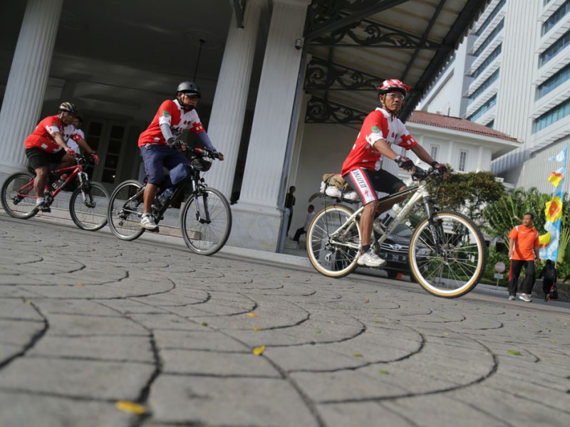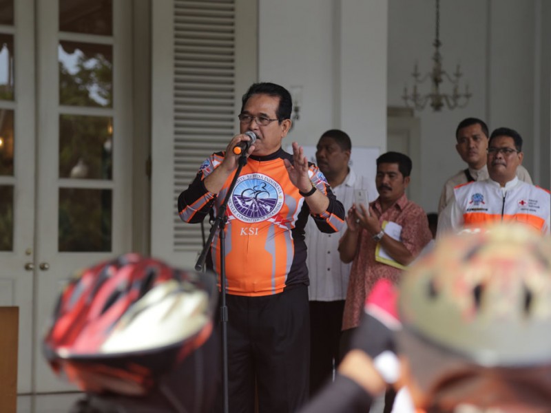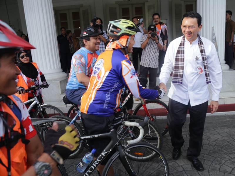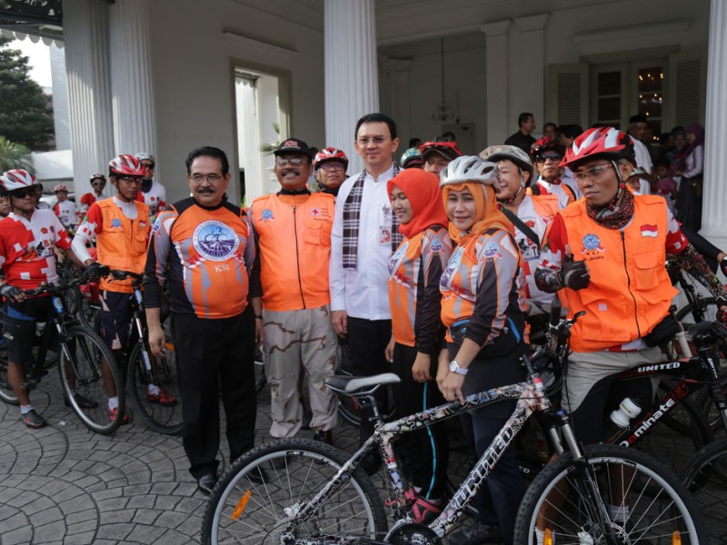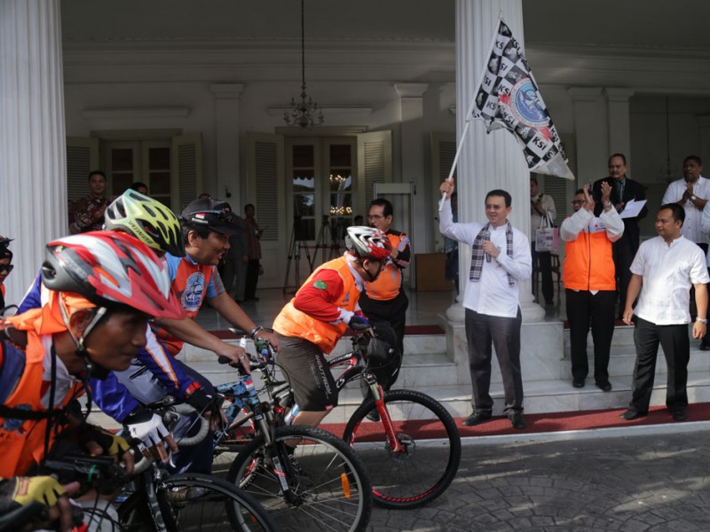 Gubernur DKI Jakarta, Basuki Tjahaja Purnama melepas rombongan Komite Sepeda Indonesia (KSI) dari halaman pendopo Balaikota DKI Jakarta menuju Bandung, Jawa Barat, Jumat (24/04/2015). Puluhan pesepeda akan menempuh rute Jakarta-Bandung sejauh kurang lebih 300 kilometer. (Reza/beritajakarta.com)