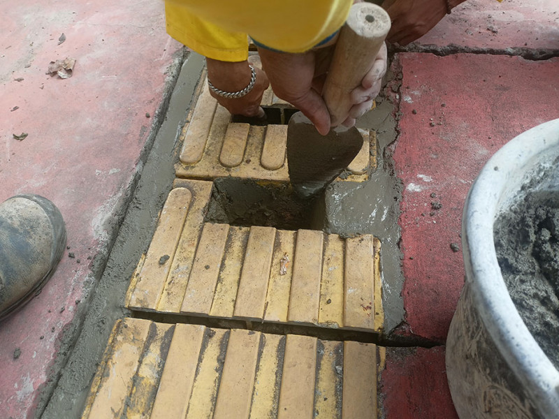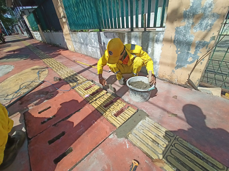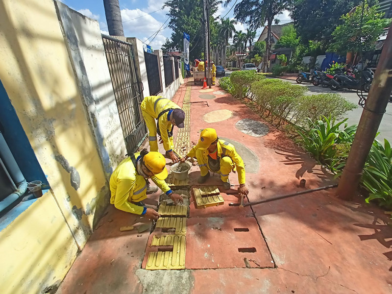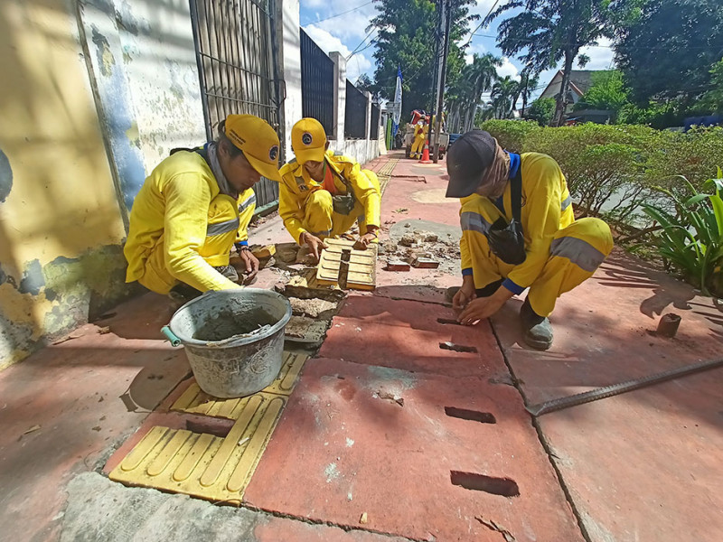 Suku Dinas Bina Marga Jakarta Pusat melakukan perbaikan beton penutup saluran air di trotoar Jalan Cempaka Putih Tengah I, Kelurahan Cempaka Putih Timur, Senin (4/7). Perbaikan dilakukan lantaran penutup mengalami ambles. (Foto: Mochamad Tresna Suheryanto/beritajakarta.id)