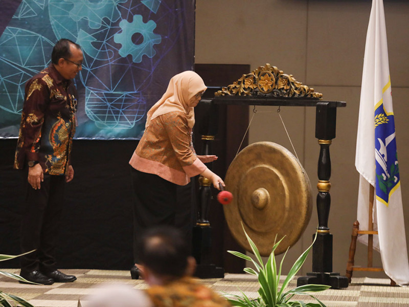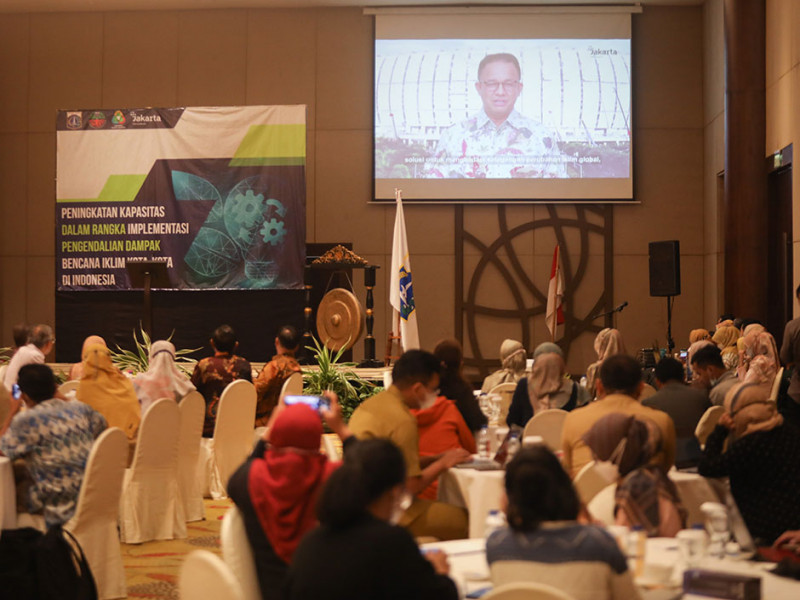 Asisten Perekonomian dan Keuangan Sekdaprov DKI Jakarta, Sri Haryati, mewakili Gubernur membuka acara Peningkatan Kapasitas dalam Rangka Implementasi Pengendalian Dampak Bencana Iklim Kota-kota di Indonesia di Hotel Discovery Ancol, Jakarta Utara, Selasa (5/7). Gubernur DKI Jakarta, Anies Baswedan, yang berhalangan hadir memberi kata sambutan secara virtual melalui rekaman video. (Foto: Nugroho Sejati/beritajakarta.id)