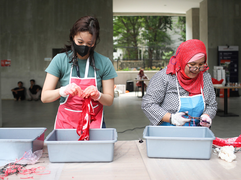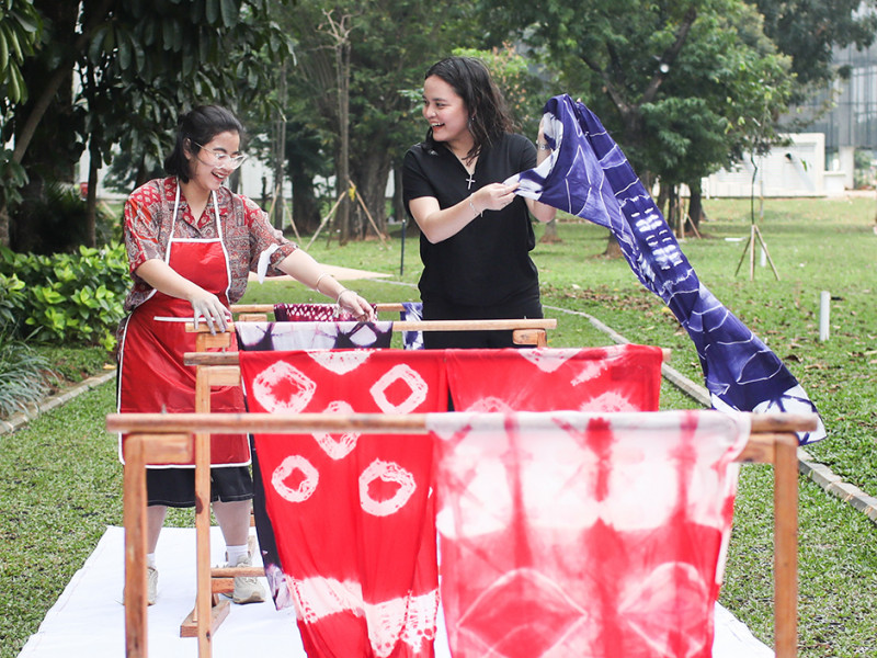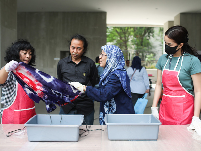 Puluhan peserta mengikuti workshop Kelas Seni Umum di selasar Gedung Panjang Taman Ismail Marzuki (TIM), Cikini, Menteng, Jakarta Pusat, Kamis (7/7). Dalam workshop ini, para peserta diajari teknik pewarnaan kain dengan zat pewarna untuk menghasilkan pola tertentu yang menarik atau tie dye dan juga membuat karya keramik. Kegiatan ini terselenggara atas kolaborasi Dinas Kebudayaan (Disbud) DKI Jakarta bersama Fakultas Seni Rupa dan Desain, Institut Kesenian Jakarta (FSRD IKJ) dan PT Jakarta Propertindo (Jakpro). (Foto: Nugroho Sejati/beritajakarta.id)