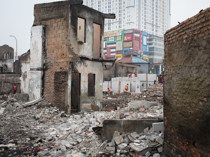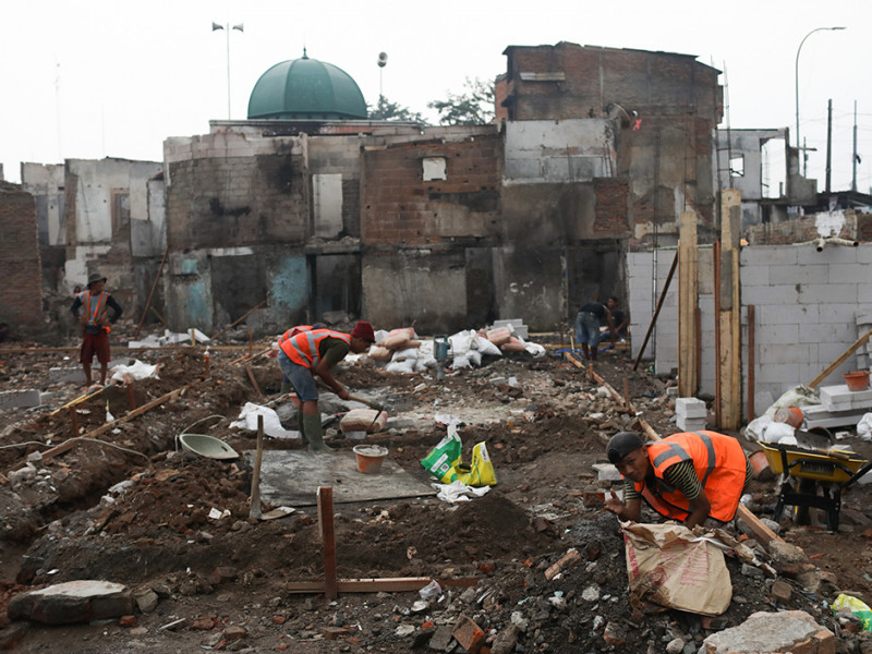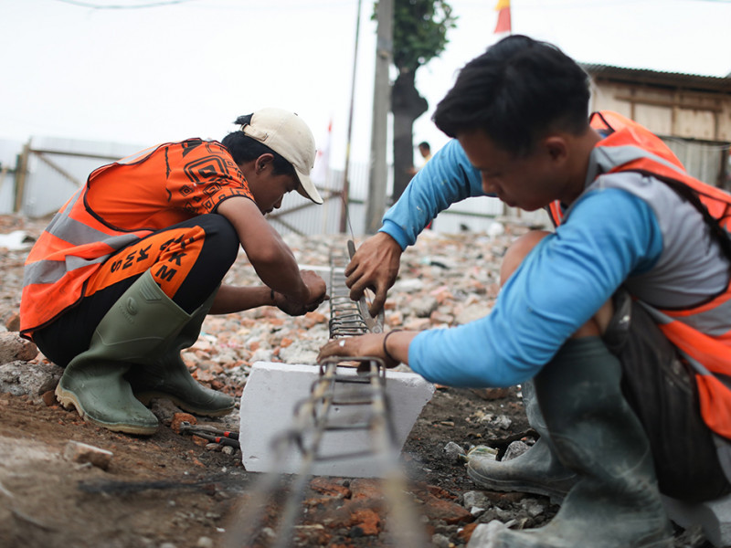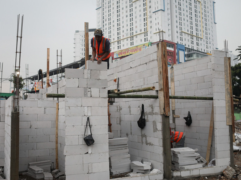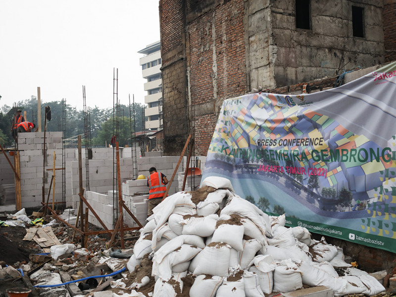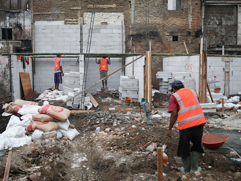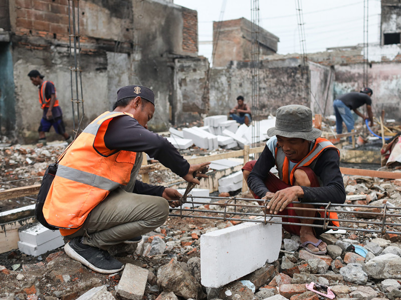 Pekerja melakukan pembangunan kembali rumah di lokasi kebakaran kawasan Pasar Gembrong, Jalan Basuki Rahmat, Cipinang Besar Utara (CBU), Jatinegara, Jakarta Timur. Pembangunan ratusan rumah oleh Pemerintah Provinsi (Pemprov) DKI Jakarta melalui Baznas Bazis Jakarta Timur tersebut ditargetkan selesai dalam waktu 90 hari. (Foto: Nugroho Sejati/beritajakarta.id)