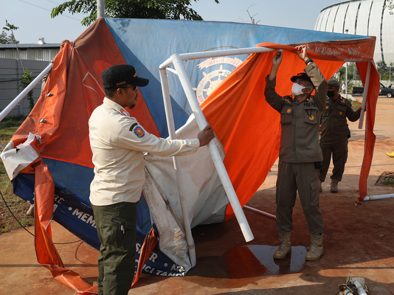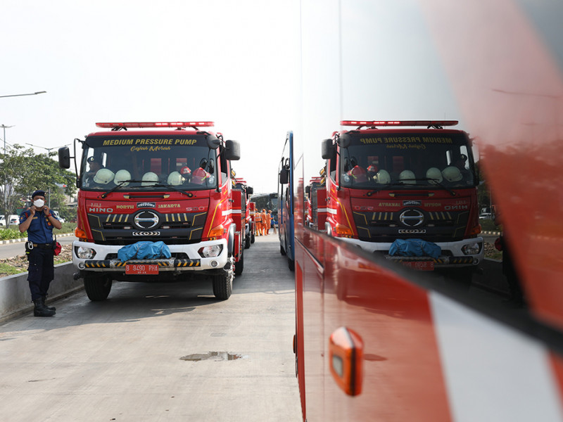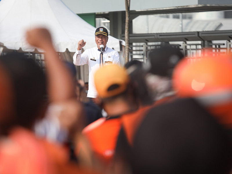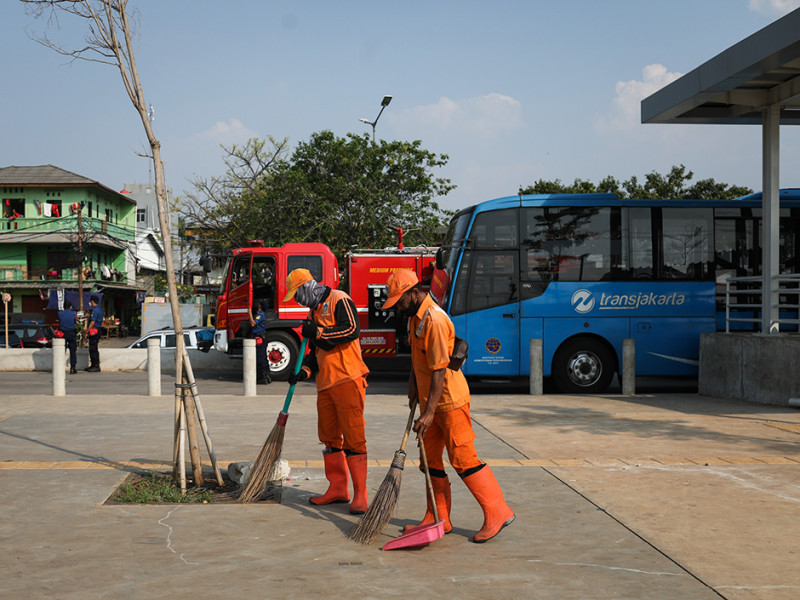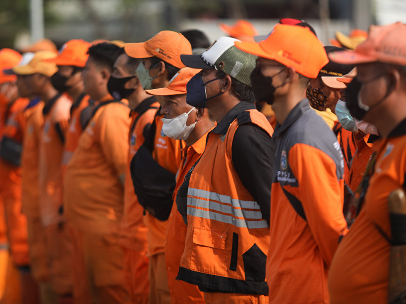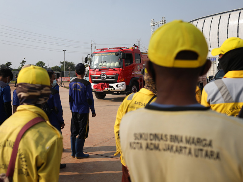 Petugas gabungan dari Suku Dinas Penanggulangan Kebakaran dan Penyelamatan (Gulkarmat), Pertamanan dan Hutan Kota, Sumber Daya Air, Bina Marga, PPSU, Satpol PP dan Perhubungan melakukan kerja bakti kawasan Jakarta International Stadium (JIS), Jakarta Utara, Jumat (8/7). Aksi bersih-bersih tersebut diawali apel bersama yang dipimpin Asisten Pembangunan dan Lingkungan Hidup Jakarta Utara, Wawan Budi Rohman. (Foto: Nugroho Sejati/beritajakarta.id)