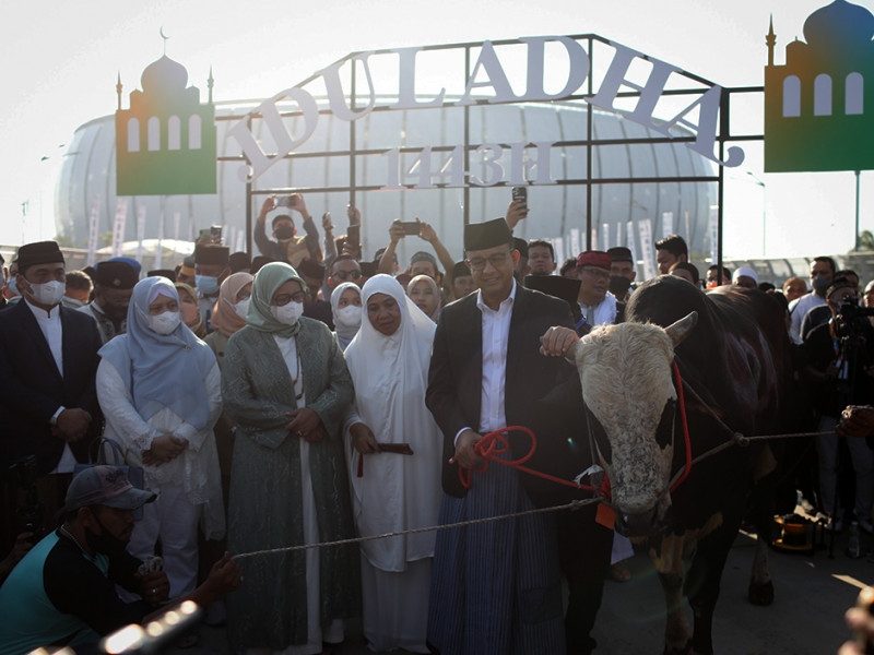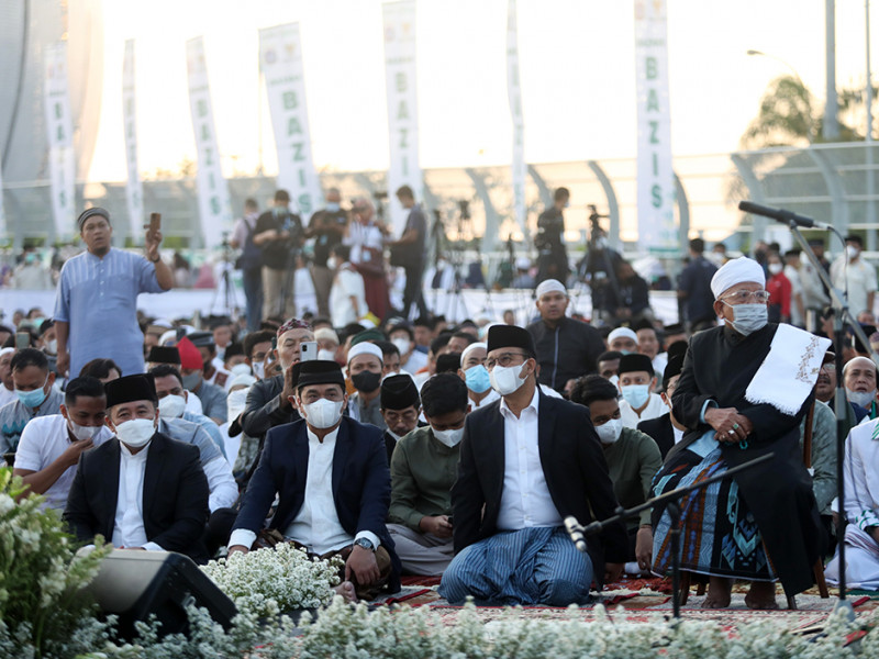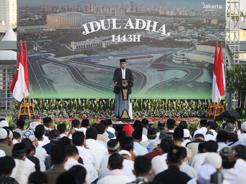 Ribuan jemaah melaksanakan ibadah Salat Iduladha 1443 Hijriah di pelataran Jakarta International Stadium (JIS), Tanjung Priok, Jakarta Utara, Minggu (10/7). Gubernur dan Wakil Gubernur DKI Jakarta turut hadir dalam pelaksanaan Salat Iduladha di JIS. (Foto: Nugroho Sejati/beritajakarta.id)
