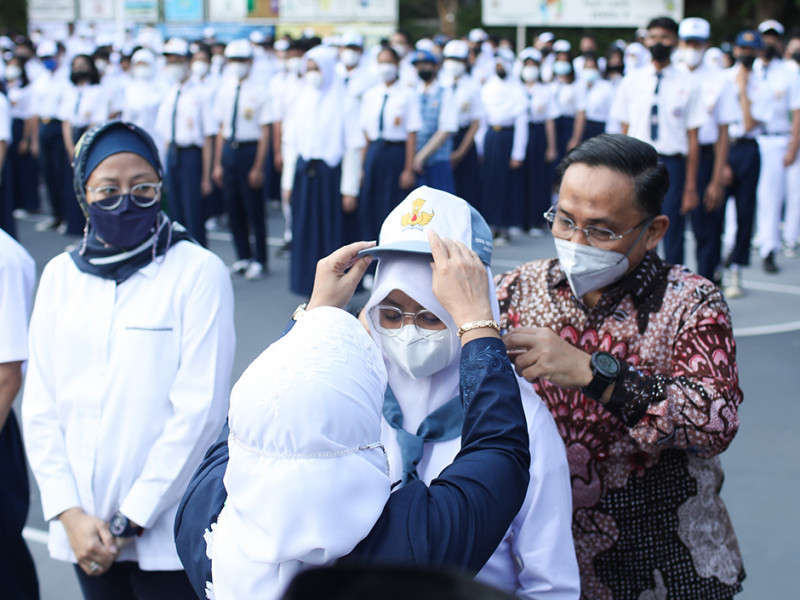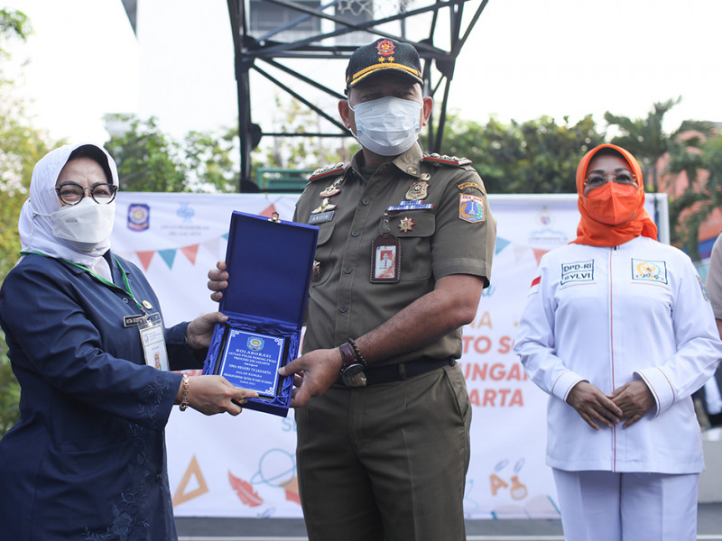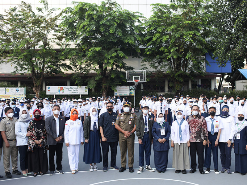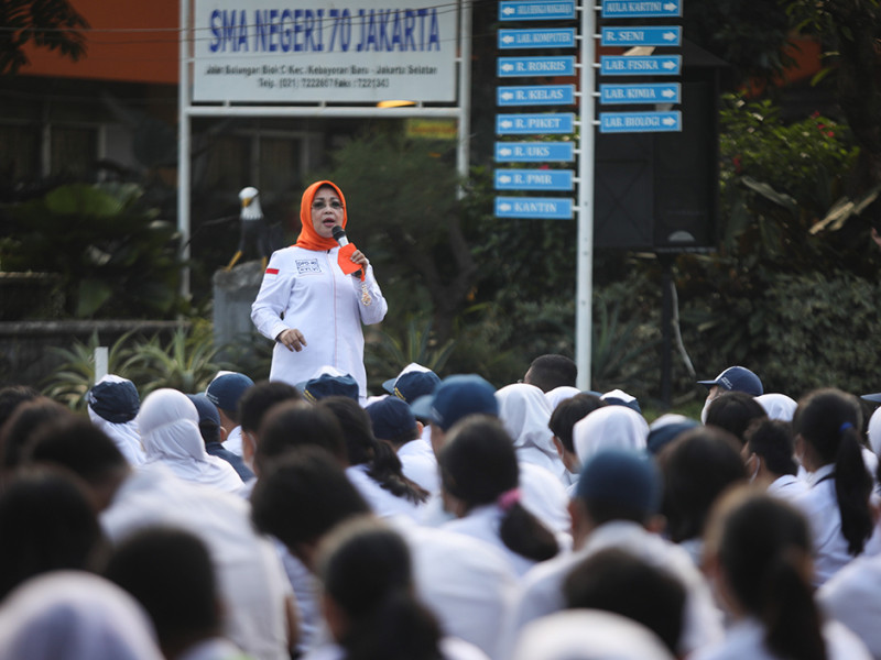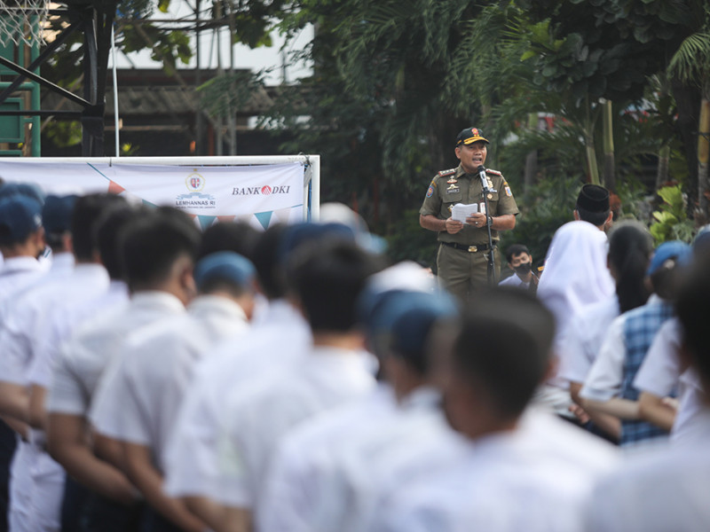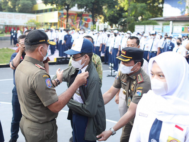 Kepala Satuan Polisi Pamong Praja (Kasatpol PP) DKI Jakarta, Arifin meluncurkan program Satpol PP Goes to School di SMAN 70, Jalan Bulungan, Kelurahan Kramat Pela, Kebayoran Baru, Jakarta Selatan, Senin (11/7). Melalui program ini, pelajar diedukasi tentang Peraturan Daerah (Perda) dan Peraturan Gubernur (Pergub) serta kebijakan pemerintah lainnya . (Foto: Nugroho Sejati/beritajakarta.id)