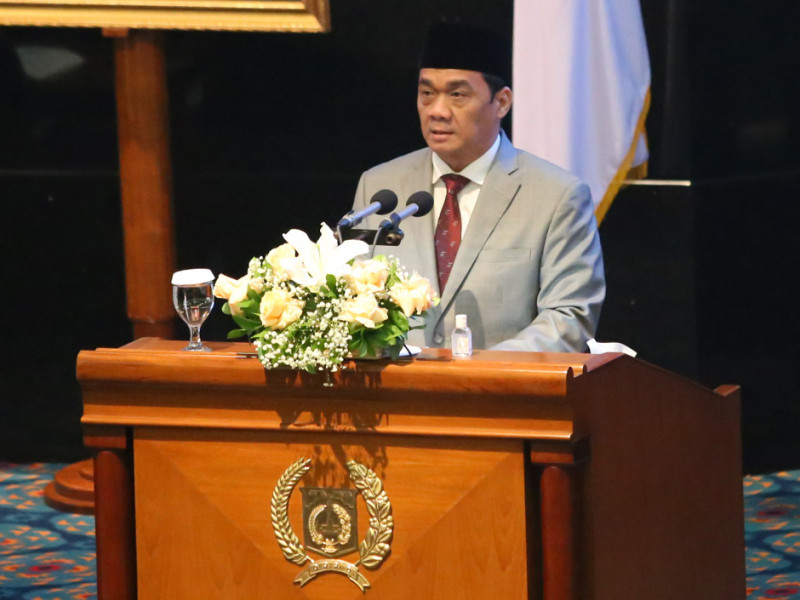 Wakil Gubernur DKI Jakarta, Ahmad Riza Patria membacakan pidato jawaban Gubernur DKI Jakarta, Anies Baswedan atas pemandangan umum fraksi-fraksi DPRD DKI Jakarta terkait tiga Rancangan Peraturan Daerah (Raperda), yakni Pengelolaan Keuangan Daerah, Rencana Induk Transportasi, dan Pengendalian Lalu Lintas Secara Elektronik. Pidato tersebut disampaikan melalui Rapat Paripurna DPRD DKI Jakarta, Selasa (12/7). (Foto: Mochamad Tresna Suheryanto/beritajakarta.id)