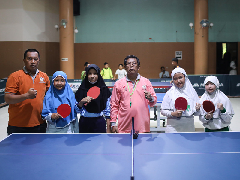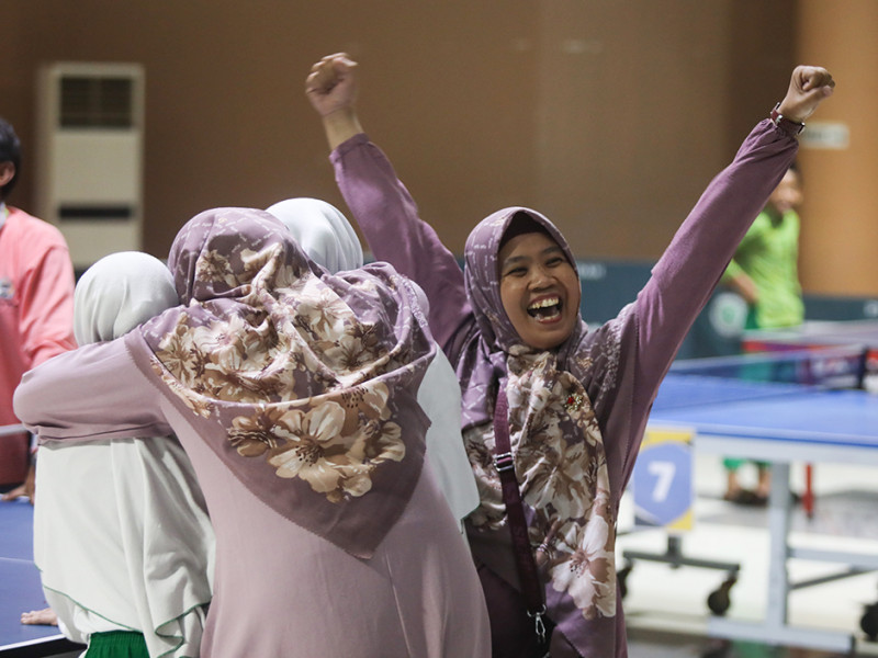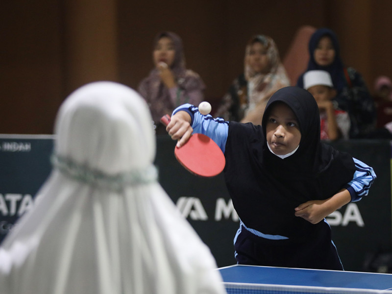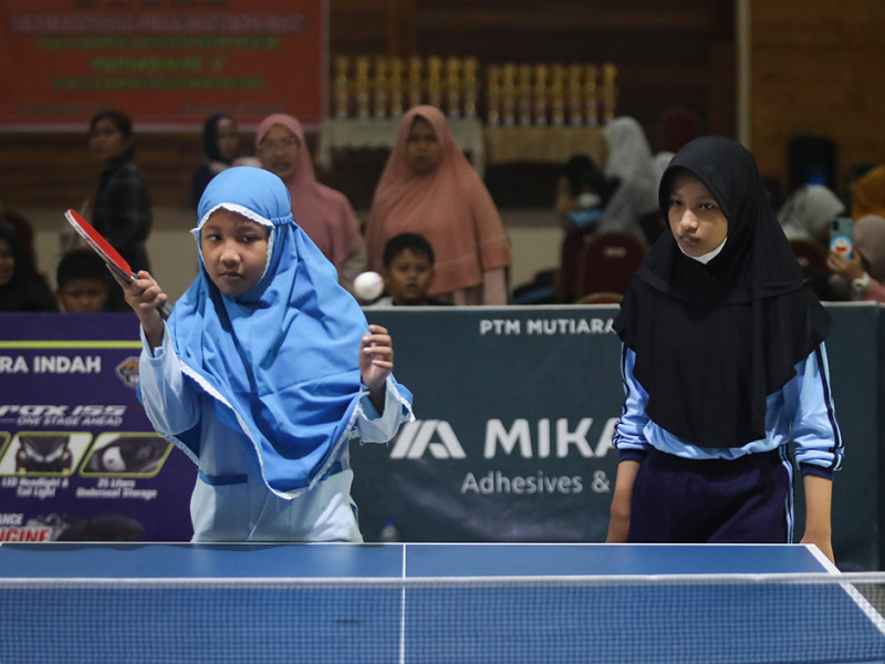 Santri dari Madrasah Diniyah (MD) Ilham I dan MD Al-Ikhlas memperebutkan gelar juara cabang tenis meja nomor ganda putri pada Pekan Olahraga dan Seni Antar Diniyah (PORSADIN) ke-5 tingkat Kota Jakarta Utara di GOR Sunter, Tanjung Priok, Rabu (13/7). Partai final tenis meja ganda putri dimenangkan oleh MD Ilham I yang diwakili oleh Laudzia Rosdan/Aiffa Aulia dengan skor 11-7; 11-5; 11-4 atas pasangan MD Al-Ikhlas. (Foto: Nugroho Sejati/beritajakarta.id)