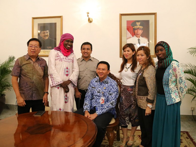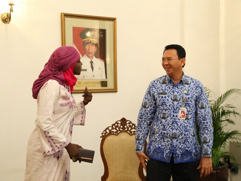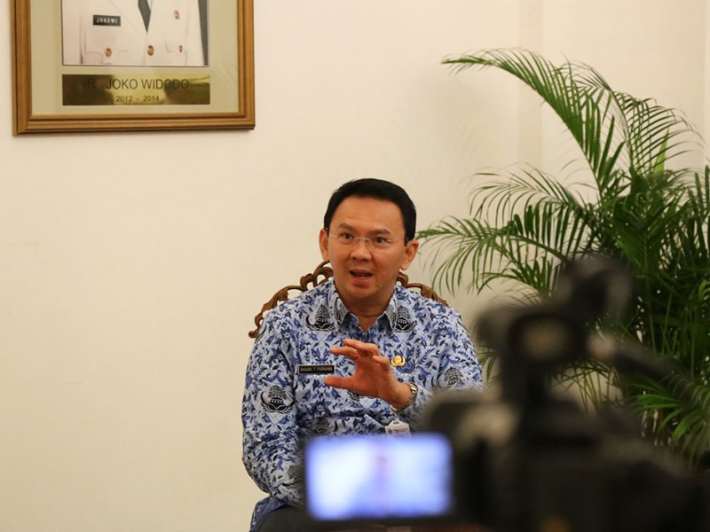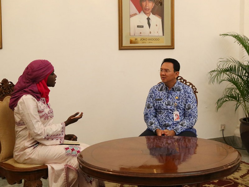 Gubernur DKI Jakarta Basuki Tjahaja Purnama melakukan tapping wawancara dengan jurnalis MME dari Senegal, Houreye Thiam di Balaikota DKI Jakarta, Senin (27/04/2015). Dalam kesempatan tersebut jurnalis MME Houreye Thiam menanyakan sepak terjang Basuki sebagai pemimpin yang berani dan bersih. (Foto: Yopie/beritajakarta.com)