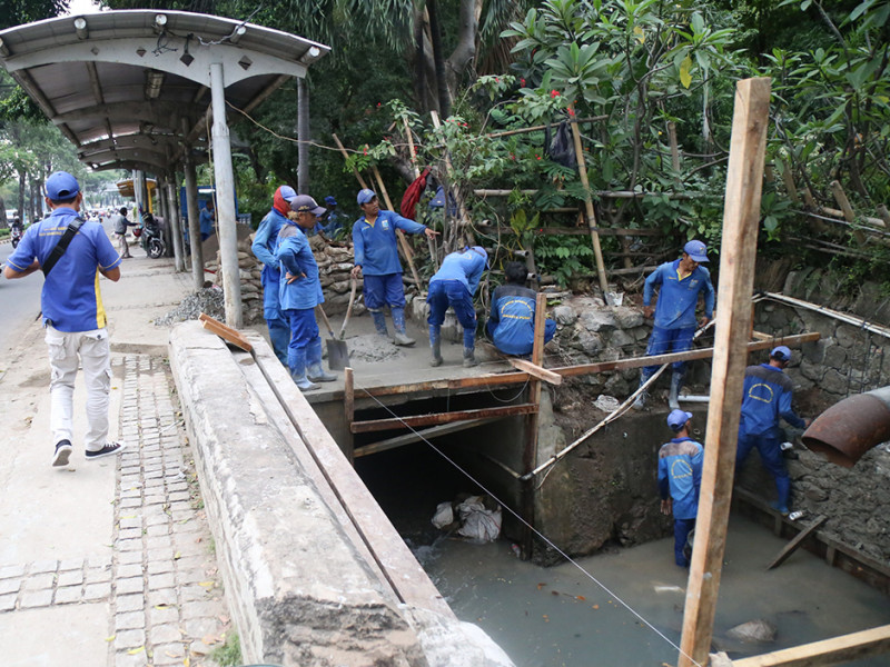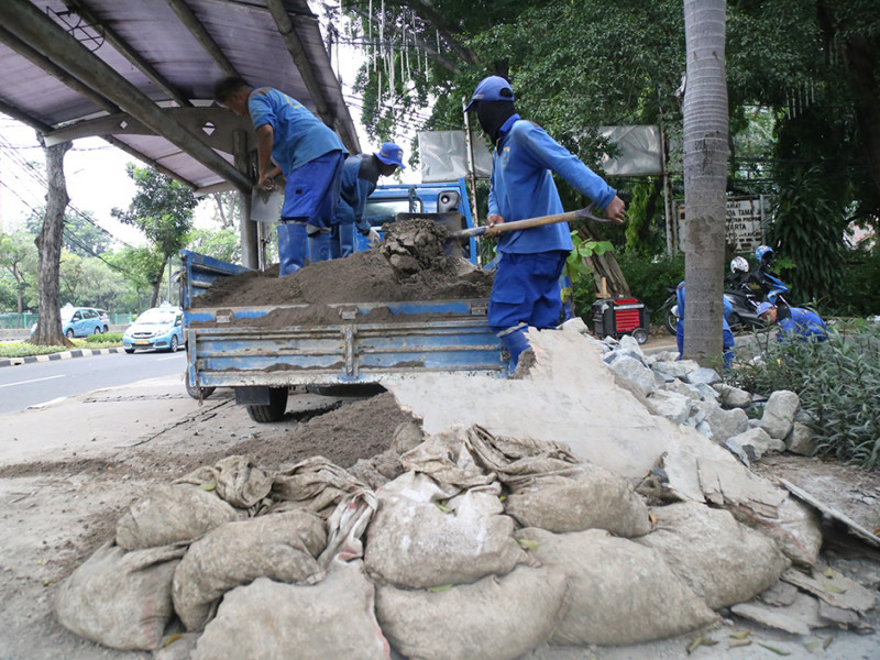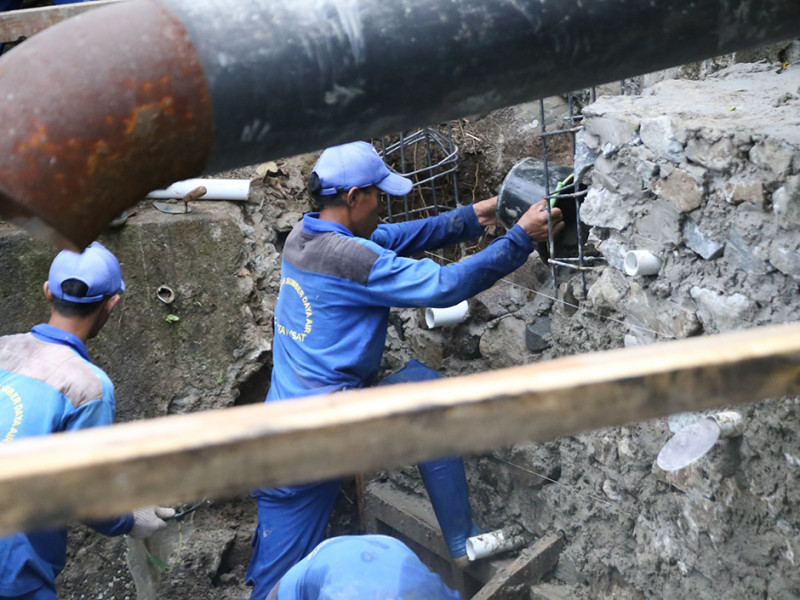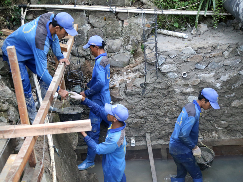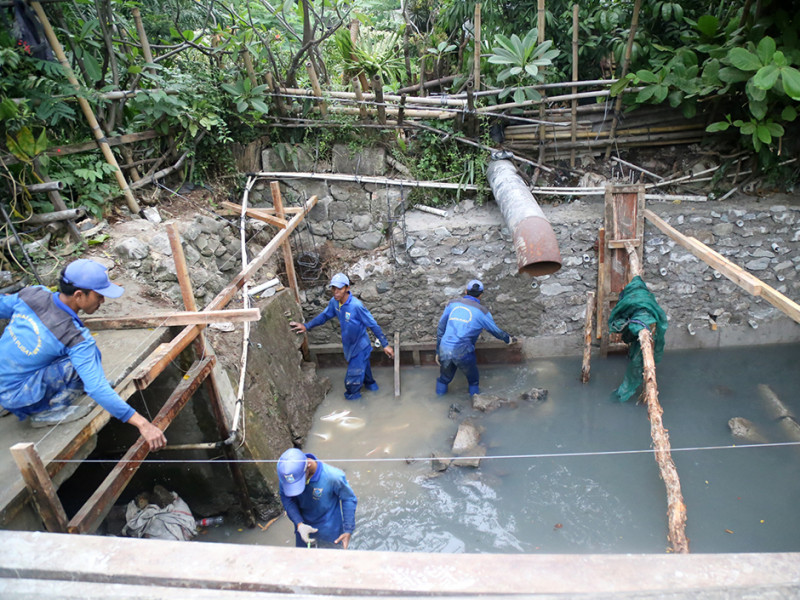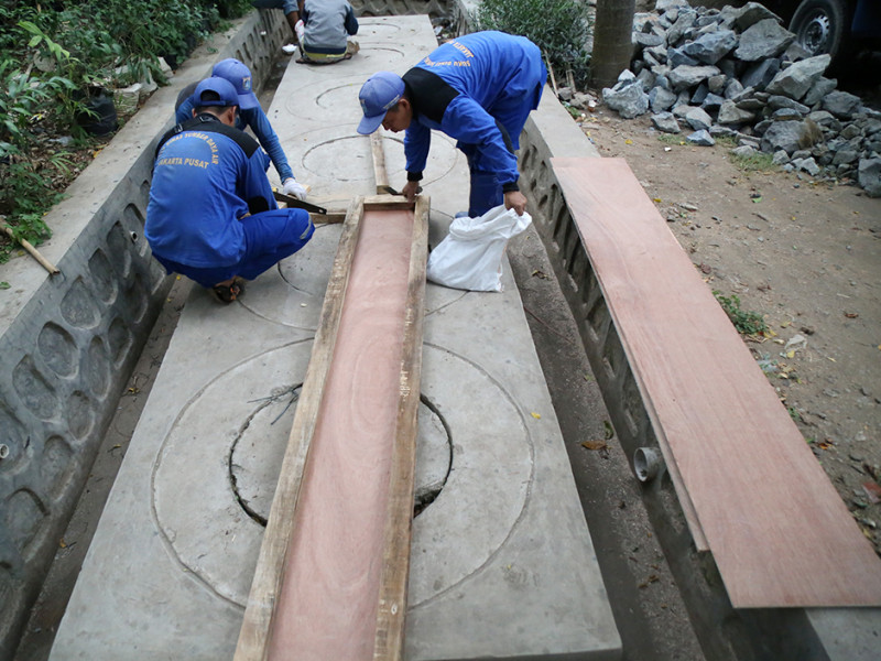 Petugas Suku Dinas Sumber Daya Air Jakarta Pusat melakukan perbaikan turap saluran air di Jalan Letjen Suprapto, Cempaka Putih, Jumat (22/7). Perbaikan dilakukan lantaran kondisi turap dengan ketinggian tiga meter mengalami longsor sepanjang enam meter. (Foto: Mochamad Tresna Suheryanto/beritajakarta.id)