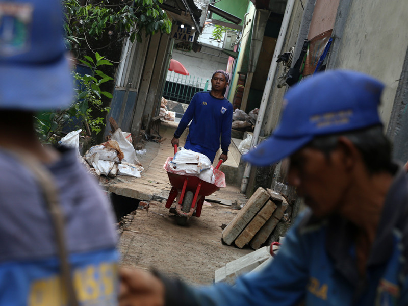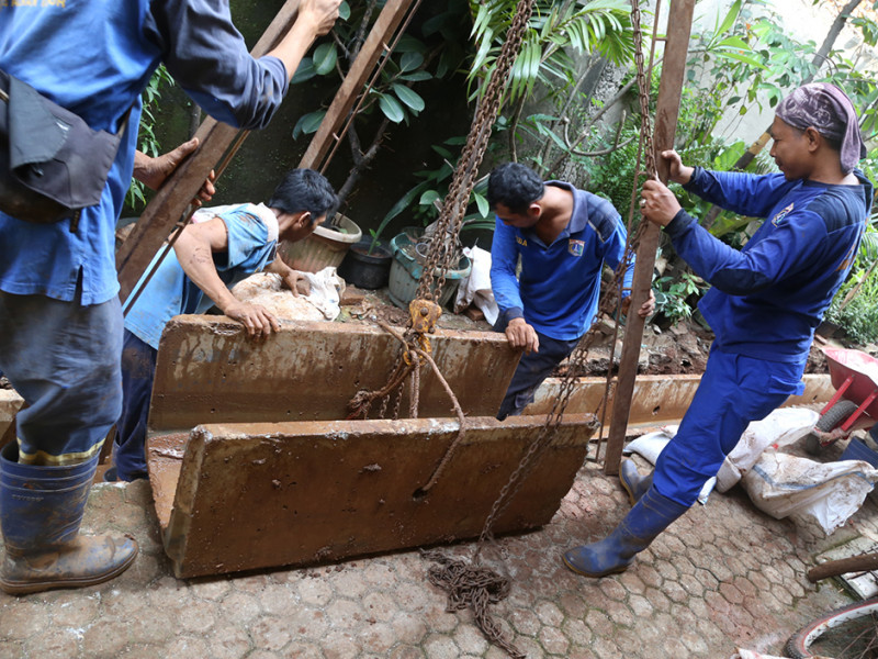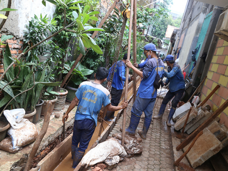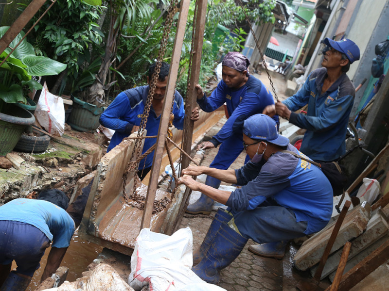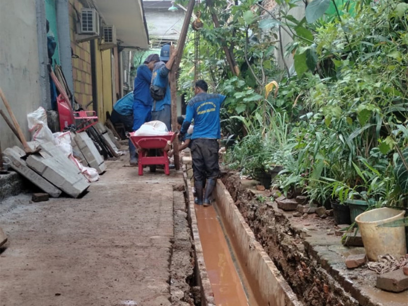 Satuan Pelaksana Sumber Daya Air (Satpel SDA) Kecamatan Mampang Prapatan, Jakarta Selatan, membuat saluran air di Gang Garuda, RT 06/03, Kelurahan Mampang Prapatan. Pembuatan saluran ini untuk memperlancar aliran air di kawasan tersebut. (Foto: Reza Hapiz/beritajakarta.id)