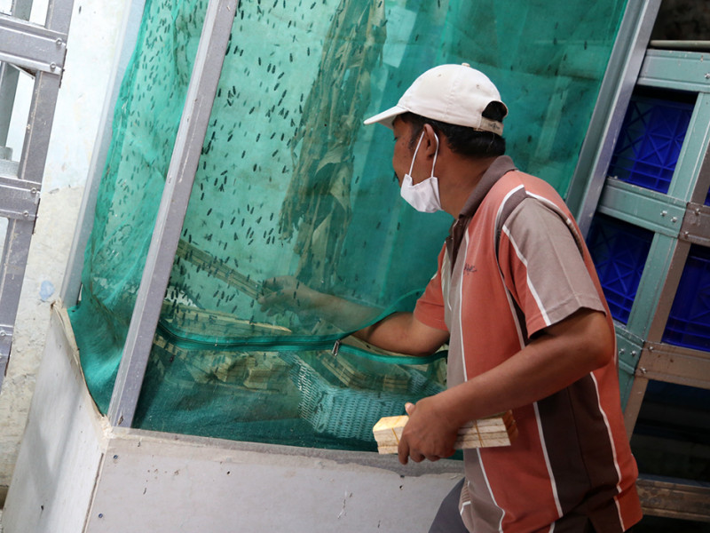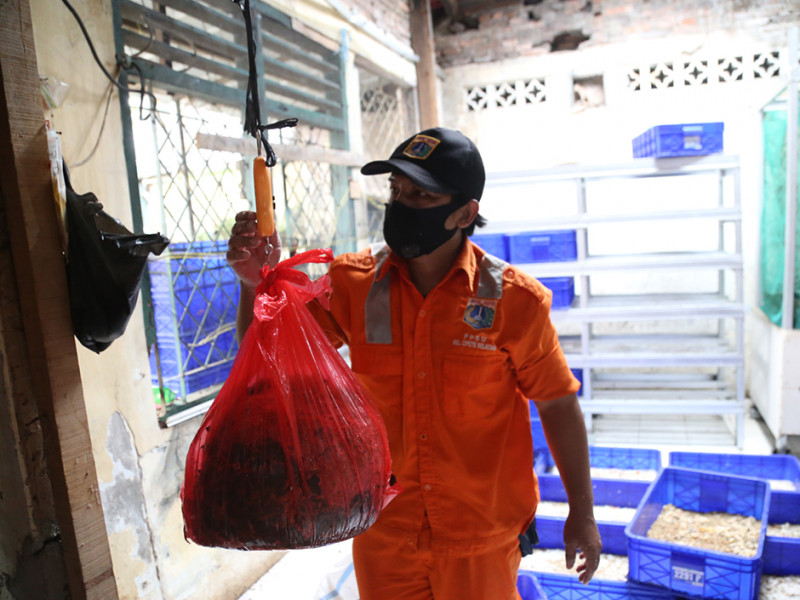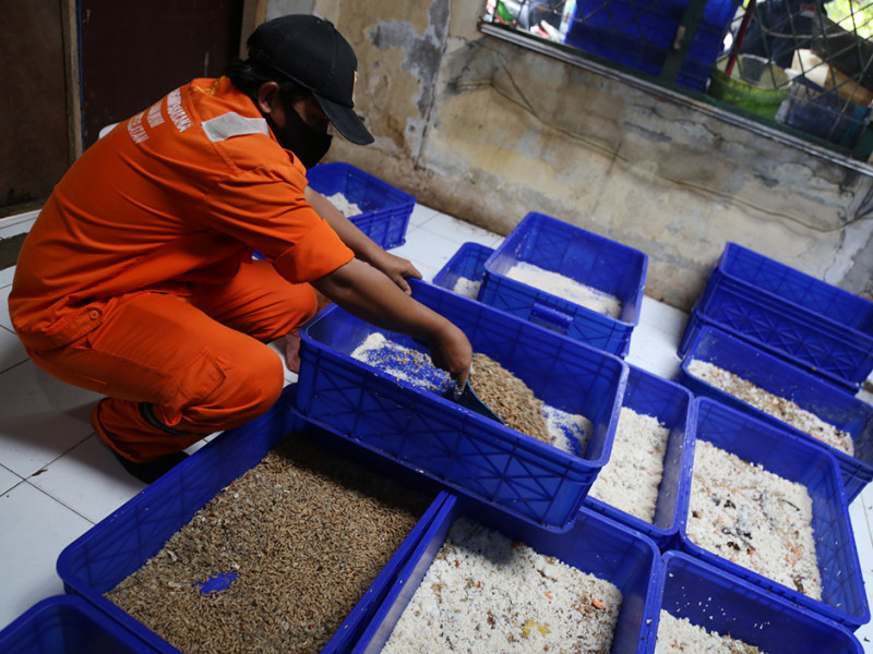 Guna mengurangi volume sampah organik di wilayahnya, warga dibantu petugas PPSU Kelurahan Cipete Selatan melakukan budi daya maggot atau larva lalat hitam. Budi daya memanfaatkan bangunan bekas kantor kelurahan di Jalan Asem II, RT 03/04, Kelurahan Cipete Selatan, Cilandak, Jakarta Selatan. Keberadaan rumah maggot ini juga berfungsi sebagai sarana edukasi bagi warga sekitar. (Foto: Reza Hapiz/beritajakarta.id)