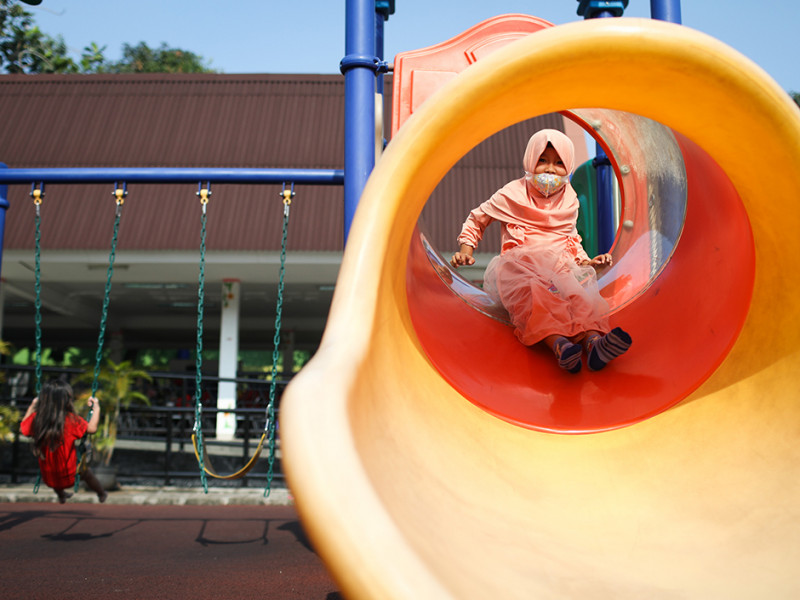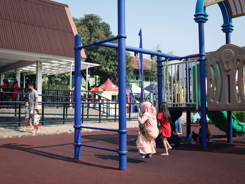 Anak-anak memanfaatkan sarana bermain yang ada di Ruang Publik Terpadu Ramah Anak (RPTRA) Pilar Jati, Kelurahan Cipinang Melayu, Kecamatan Makasar, Jakarta Timur. Selain sarana bermain, RPTRA Pilar Jati juga dilengkapi lapangan olahraga, selasar serbaguna, serta fasilitas yang ramah bagi penyandang disabilitas. (Foto: Nugroho Sejati/beritajakarta.id)