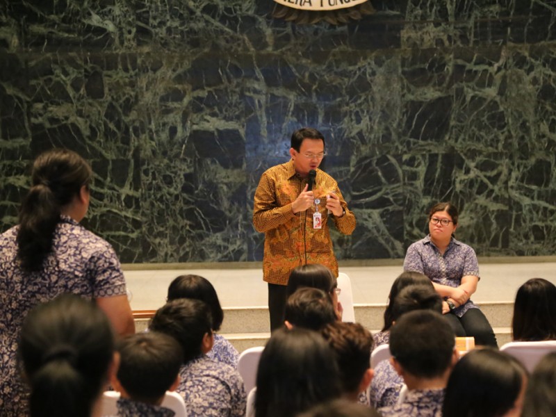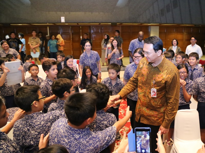 Gubernur DKI Jakarta, Basuki Tjahaja Purnama menerima kunjungan peserta didik dari Sekolah Global Sevilla Pulo Mas, di Balaikota DKI Jakarta, Basuki Tjahaja Purnama. Ya, Basuki selalu memberikan kesempatan dan meluangkan waktu kepada para murid yang ingin bertemu dengannya termasuk untuk belajar dan mengetahui lebih banyak tentang Ibukota.(Foto: Yopie / Beritajakarta.com)