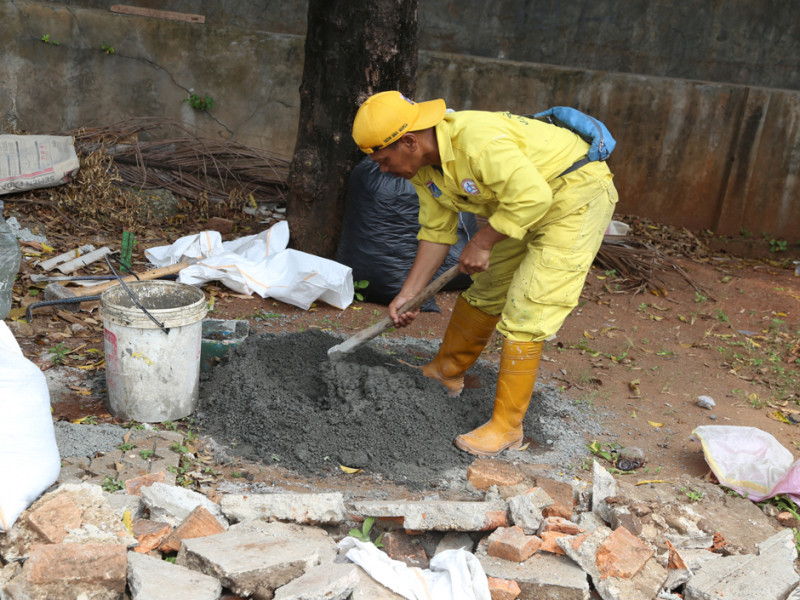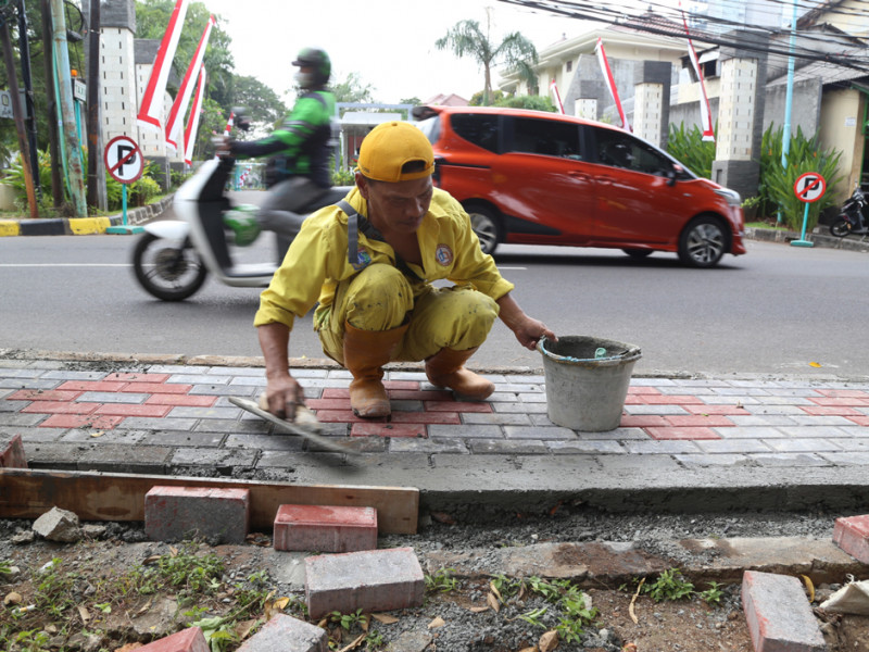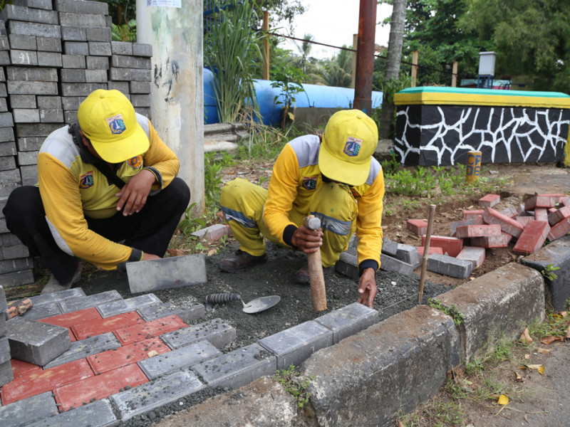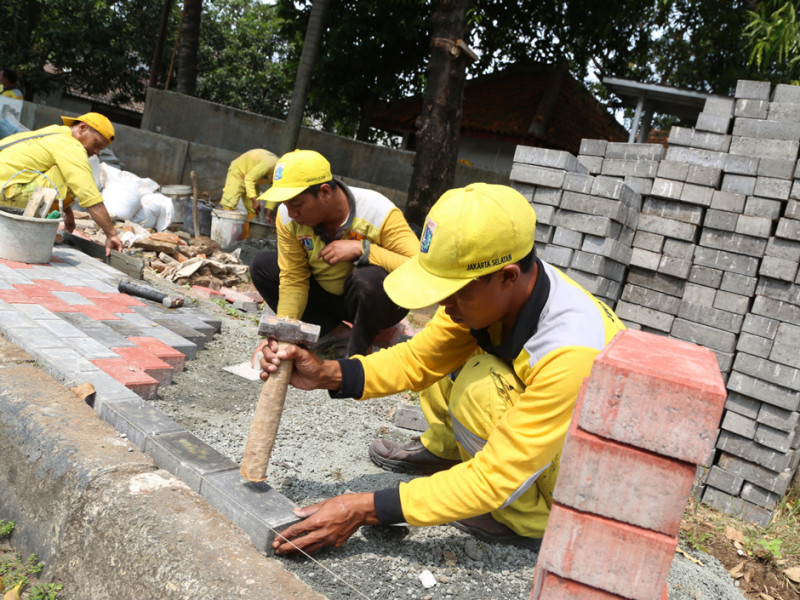 Tujuh personel Satuan Pelaksana (Satpel) Bina Marga Kecamatan Mampang Prapatan, Jakarta Selatan, melakukan perbaikan trotoar sepanjang 114 meter di Jalan Kemang Selatan VIII, Kelurahan Bangka. Trotoar selebar 90 sentimeter ini diperbaiki sejak 29 Juli lalu dan ditargetkan selesai akhir pekan ini. (Foto: Reza Hapiz/beritajakarta.id)
