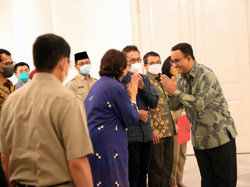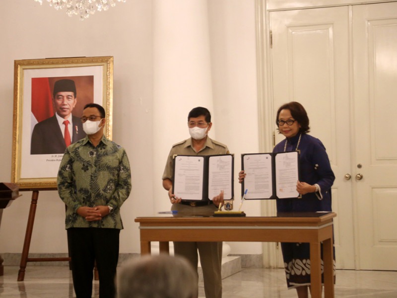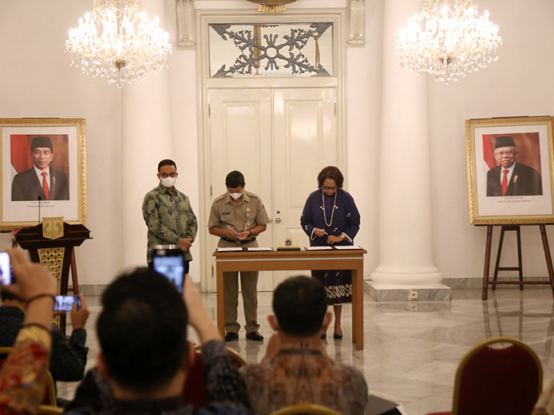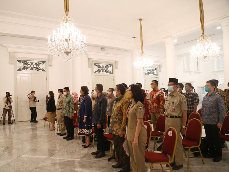 Pemerintah Provinsi (Pemprov) DKI Jakarta menjalin kerja sama dengan PT Pricewaterhouse Coopers (PWC) Consulting Indonesia terkait Dukungan Teknis Implementasi Sistem Pemerintahan Berbasis Elektronik (SPBE) dan Transformasi Digital di Pemprov DKI Jakarta. Penandatanganan perjanjian kerja sama disaksikan langsung oleh Gubernur DKI Jakarta, Anies Baswedan beserta jajaran, di Balairung, Balai Kota Jakarta, Senin (8/8). (Foto: Mochamad Tresna Suheryanto/beritajakarta.id)